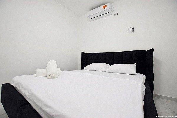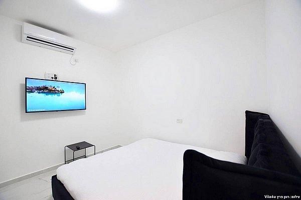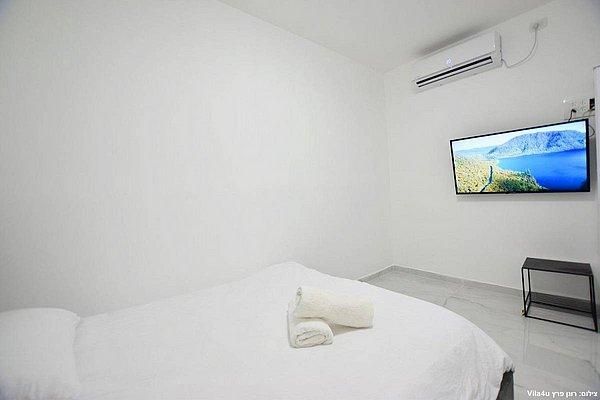 מיטה זוגית מוצעת ומפנקת, מיזוג אוויר, שידה וטלוויזיה בגודל 40 אינץ'.