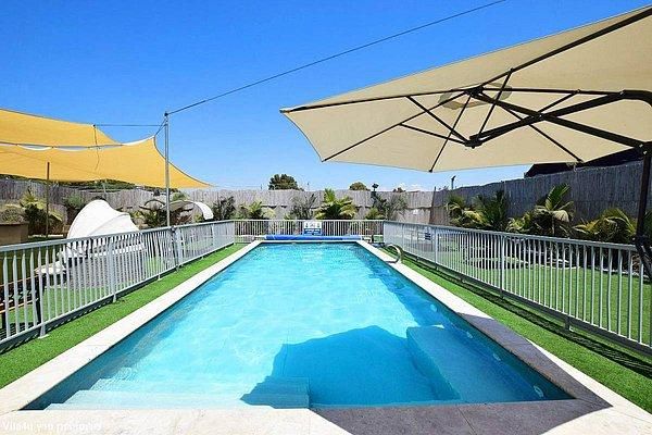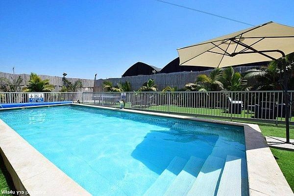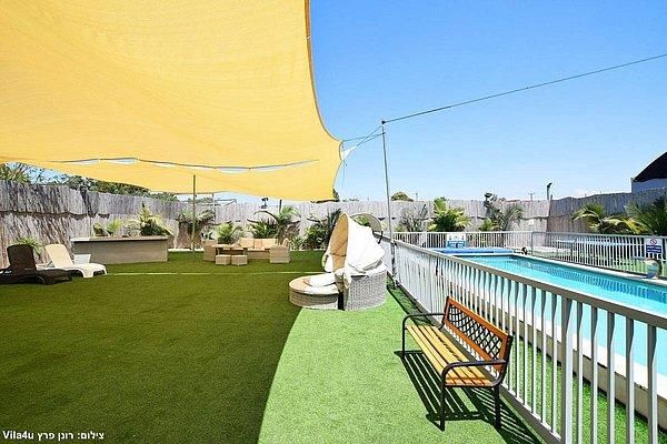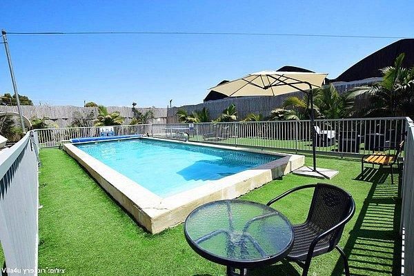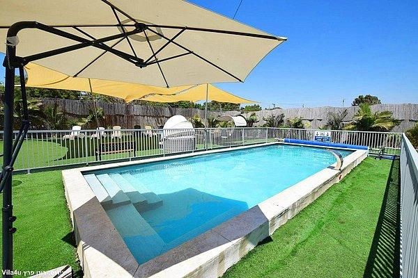 בריכה בגודל 10×5 מטר, עומק 1.50- 1.00 מטר כוללת מפל מים וספסל ג'קוזי עם 12 ג'טים