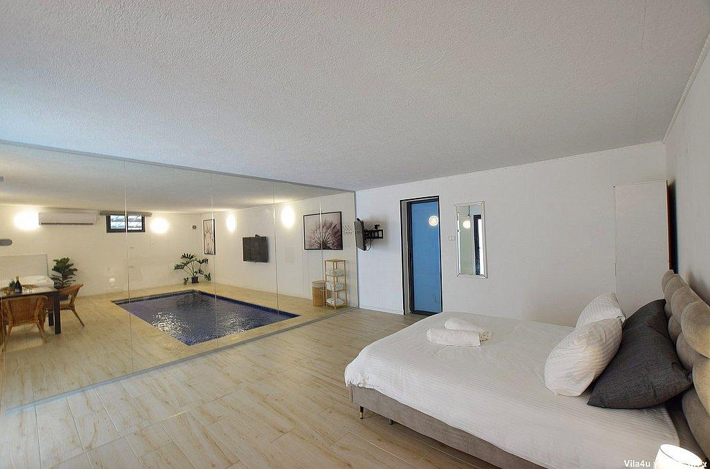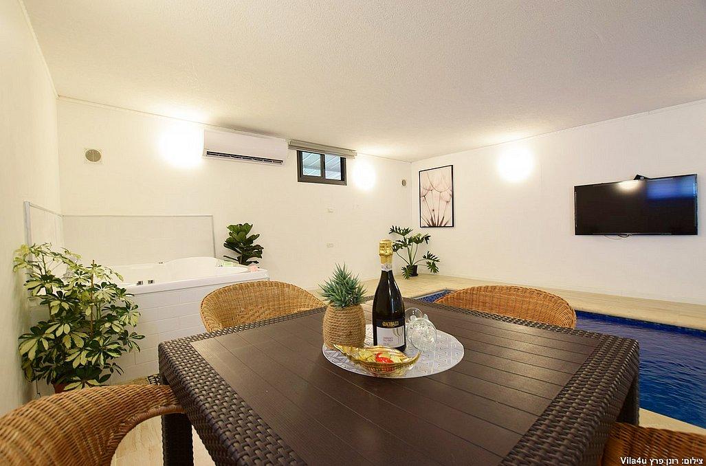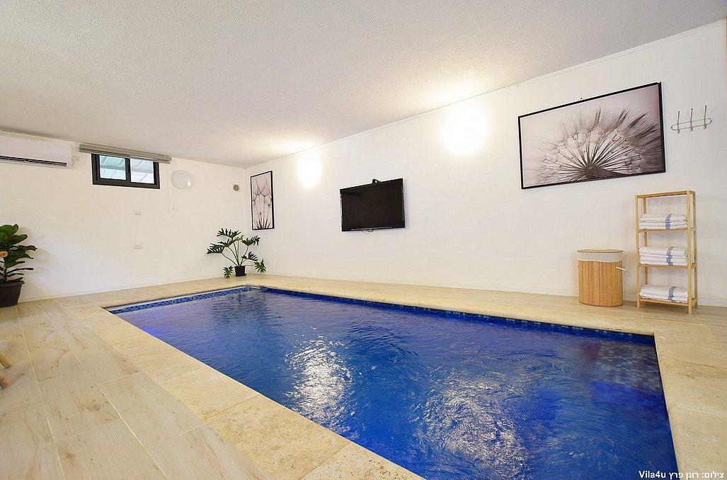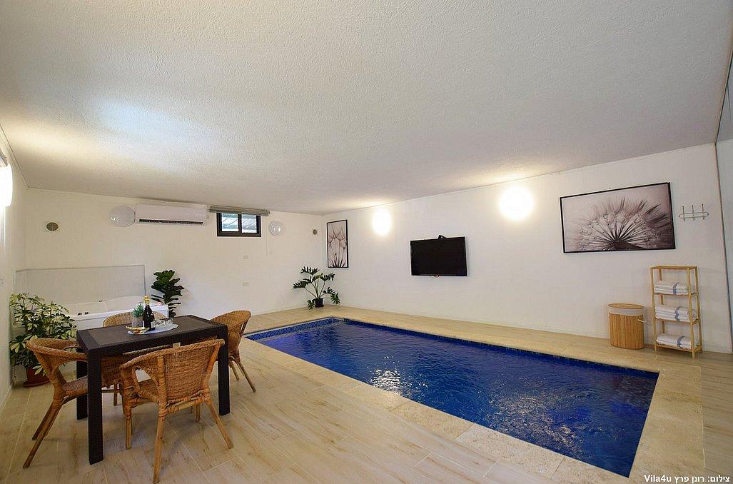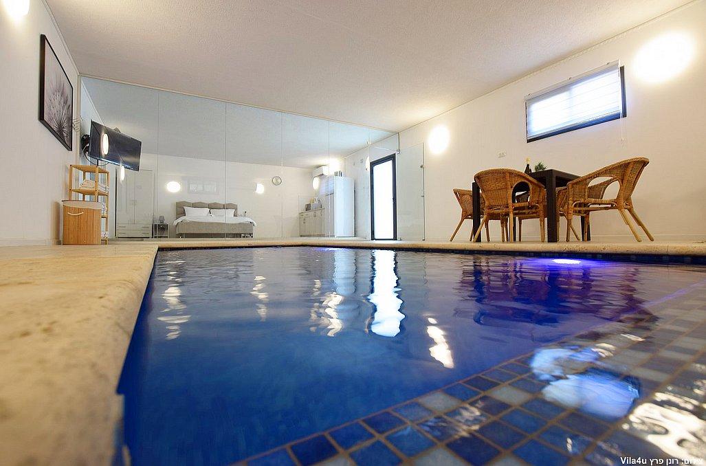 בריכת שחייה מחוממת בגודל 5X 3.5, (לבטיחות קיים קיר זכוכית אשר מפריד בין החדר למתחם הבריכה)