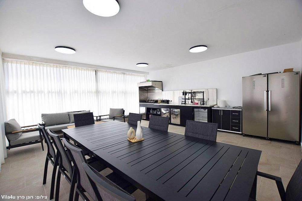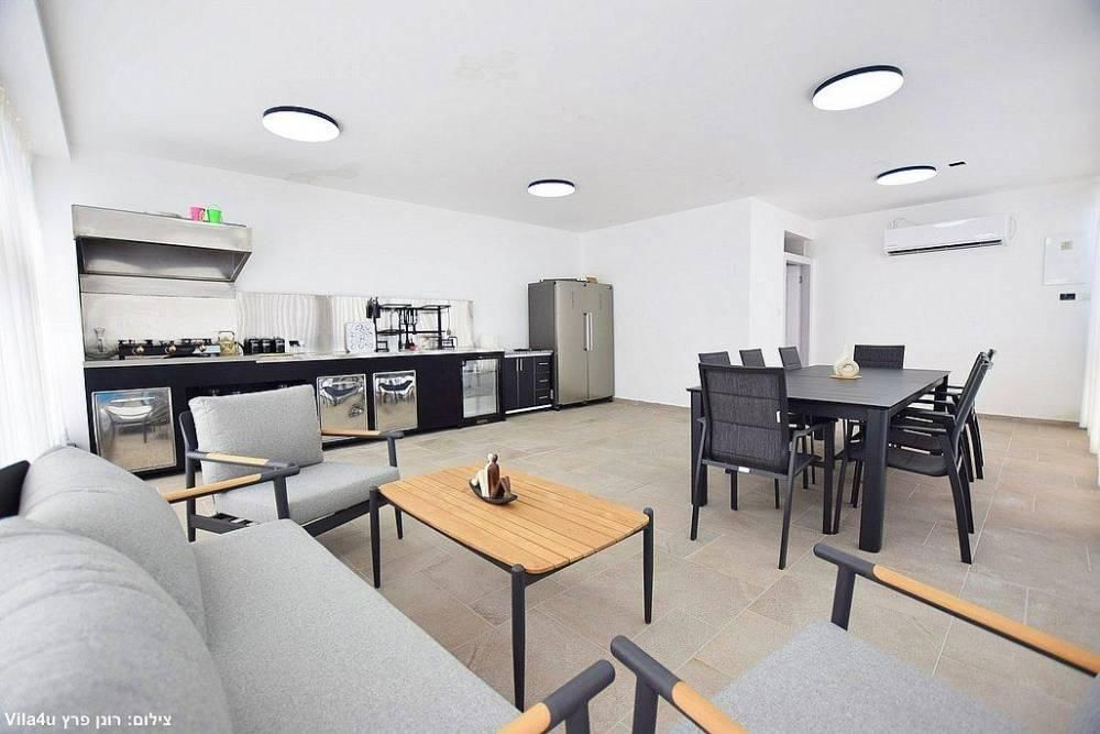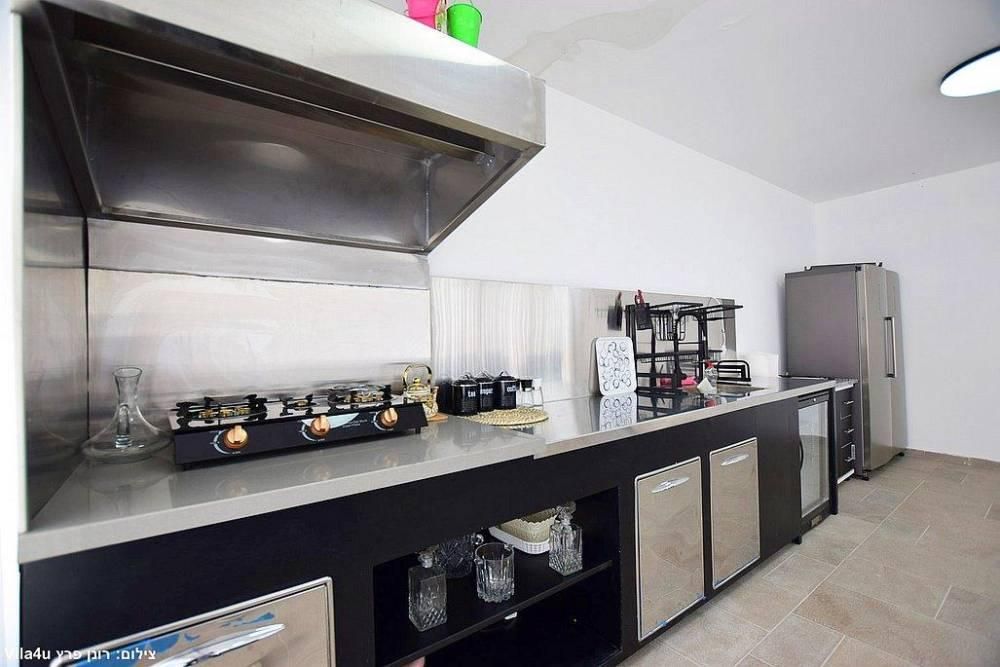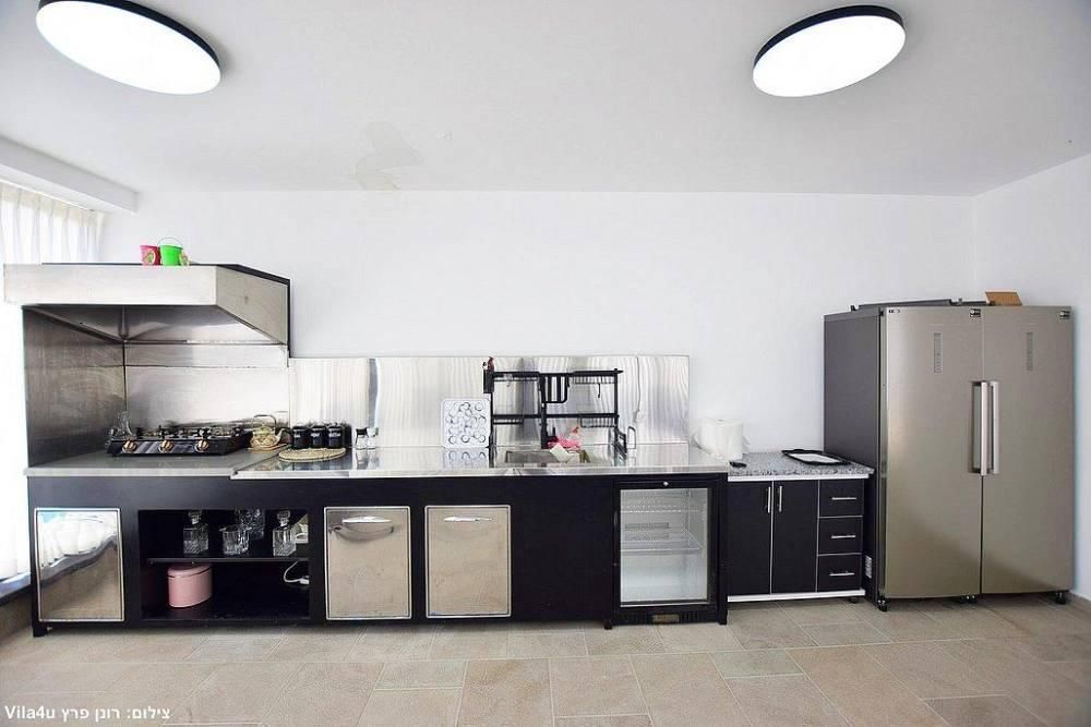 מטבח חוץ הכולל: משטח עבודה, מקרר, מקפיא וציוד מטבח