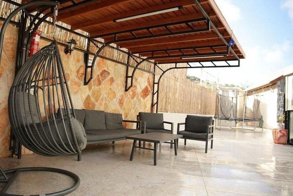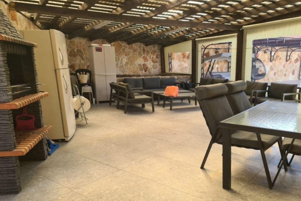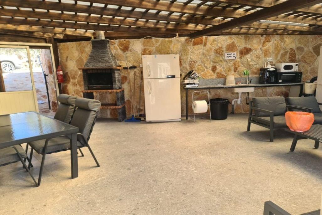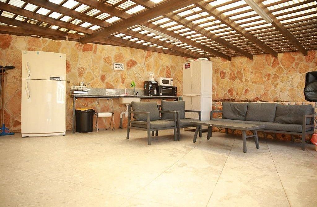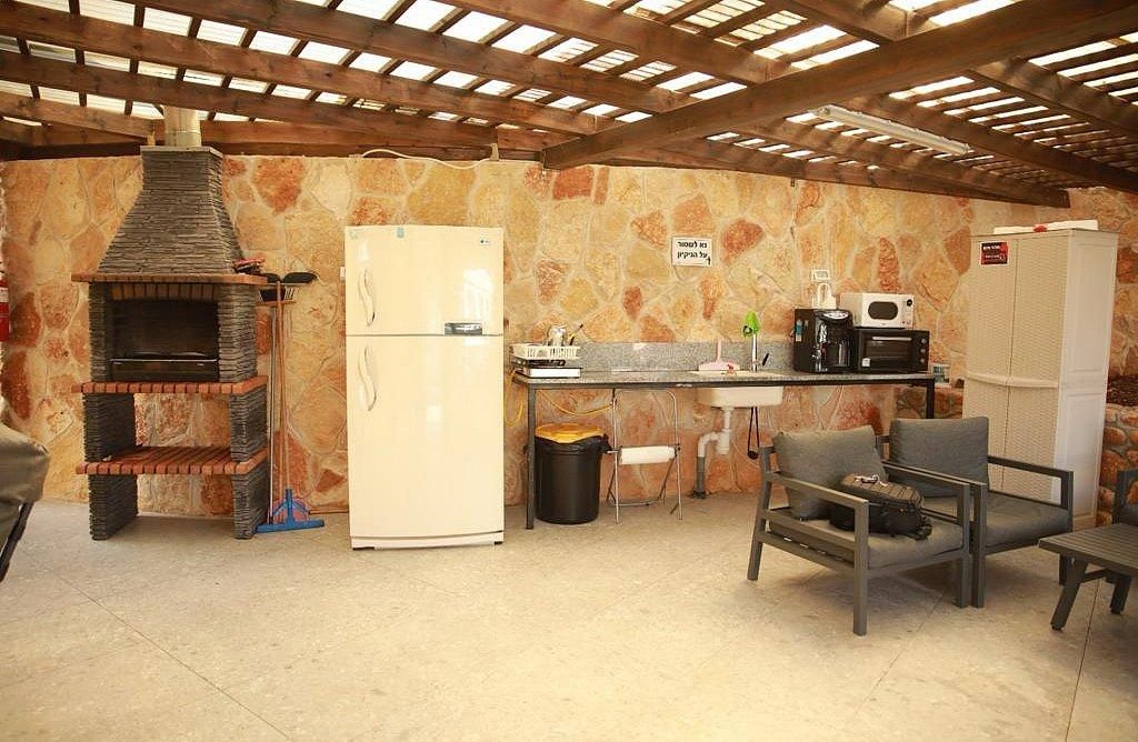 מטבחון חיצוני הכולל עמדת מנגל מסודרת, מקרר גדול, מקפיא שוכב, תמי4, מיקרוגל וכיריים גז.
