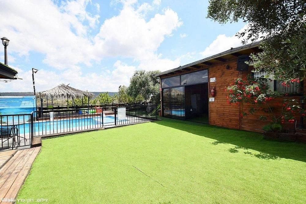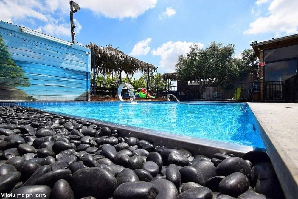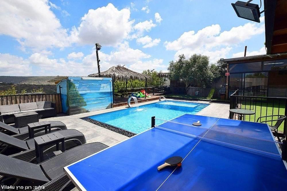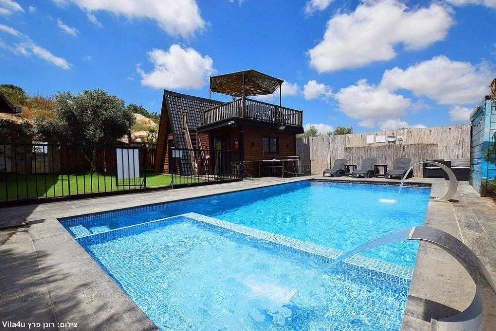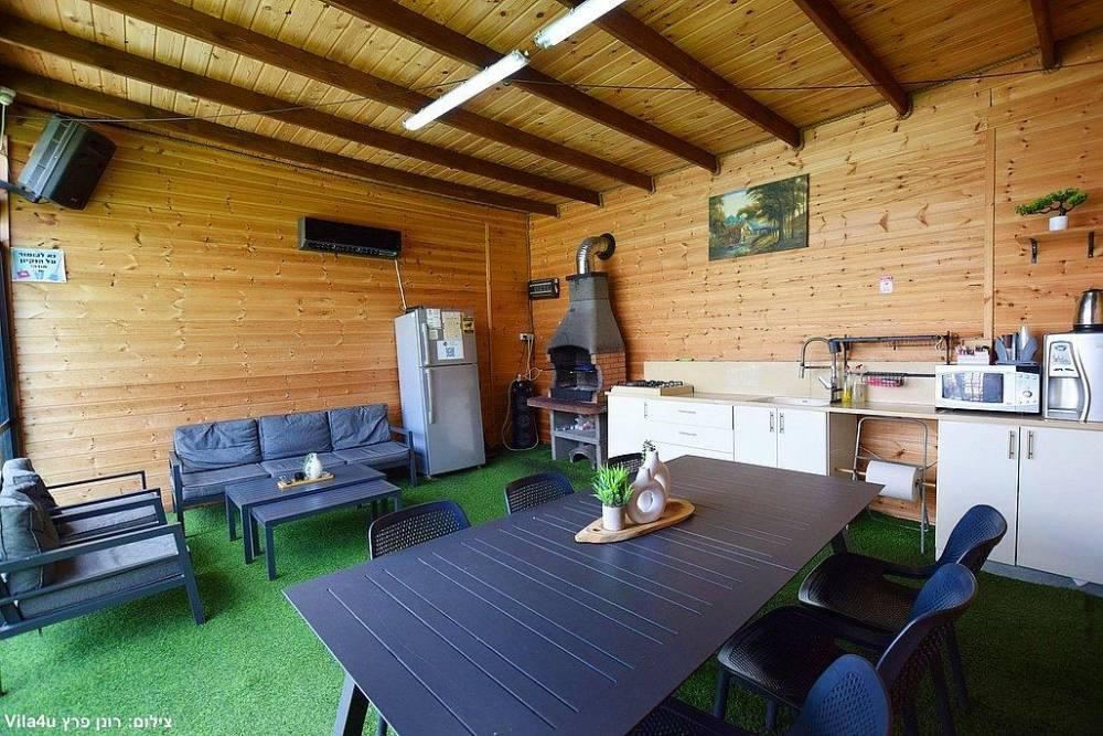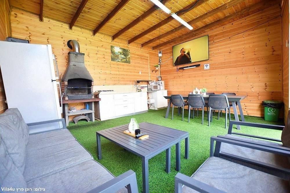 המתחם החיצוני כולל בריכת שחייה מחוממת מקורה, פינות ישיבה נוחות, עמדת גריל איכותית ומשחקי שולחן להנאת כל המשפחה.