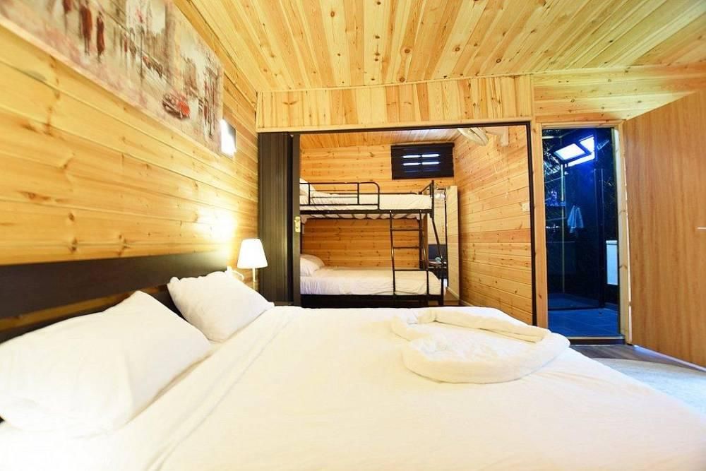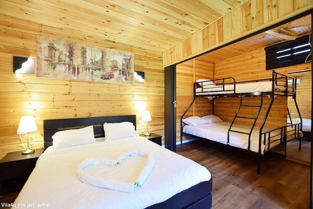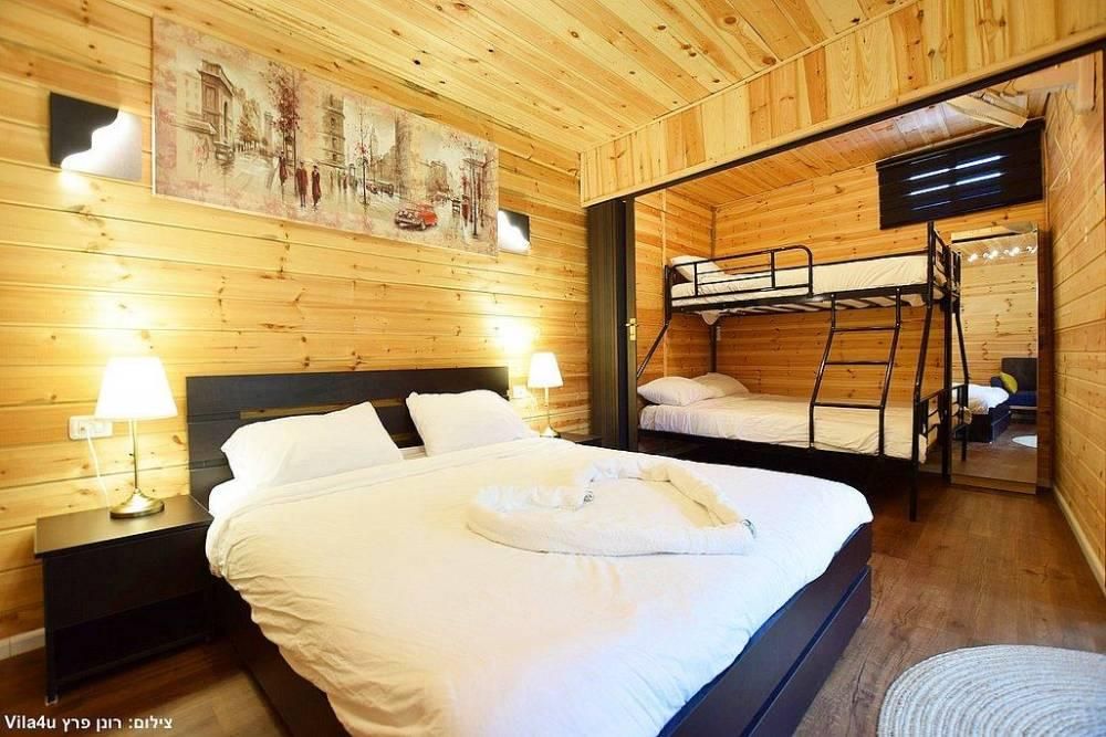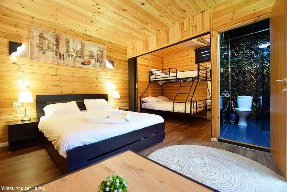- 2 חדרי שינה לכל בקתה, כולל חדר ילדים עם מיטות קומותיים.