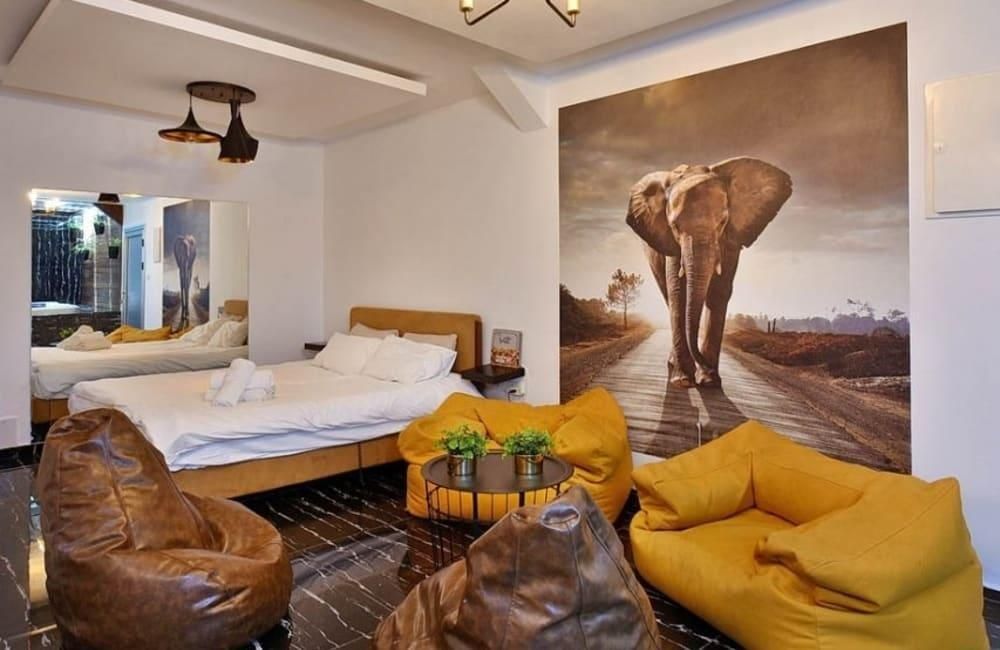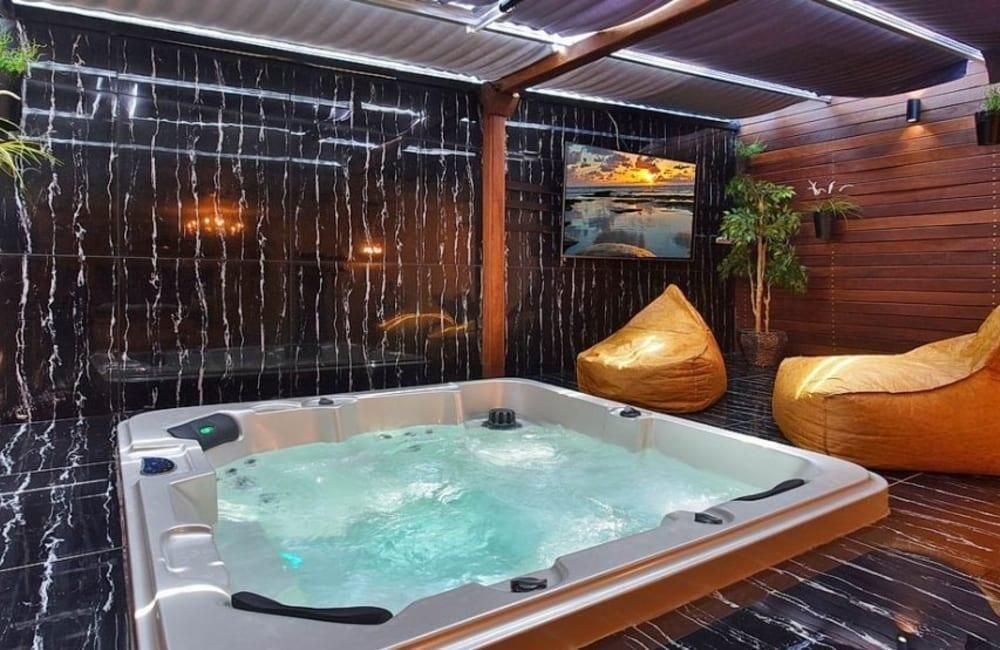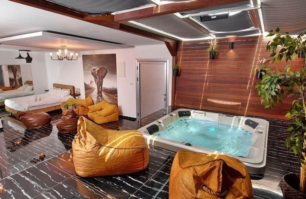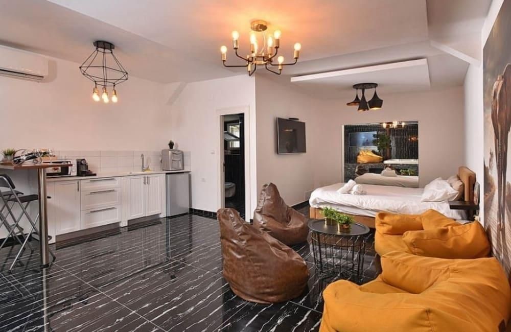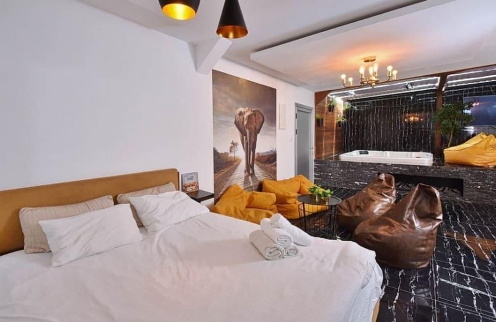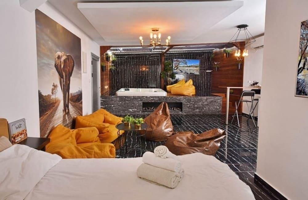 סוויטה יוקרתית בעיצוב מרשים עם ג'קוזי ספא זרמים ענקי מפנק במיוחד, מיטה זוגית נינוחה, מטבחון מאוכבזר הכולל מכונת אספרסו, בר ישיבה וגם פינת פופים מגניבה