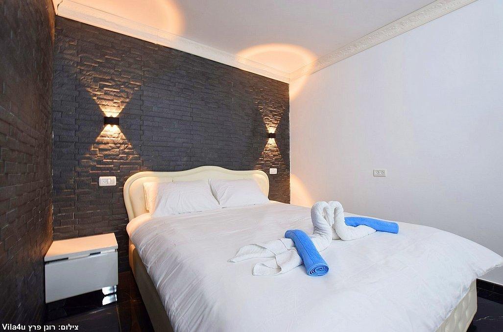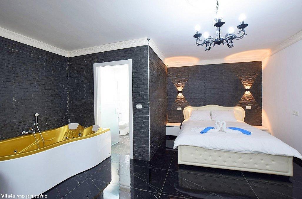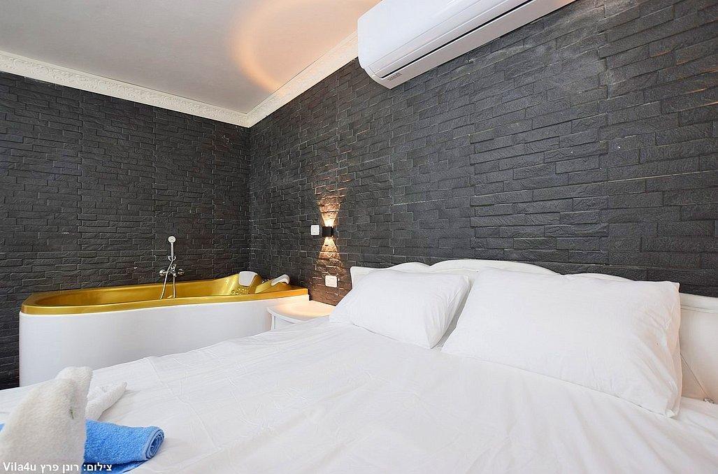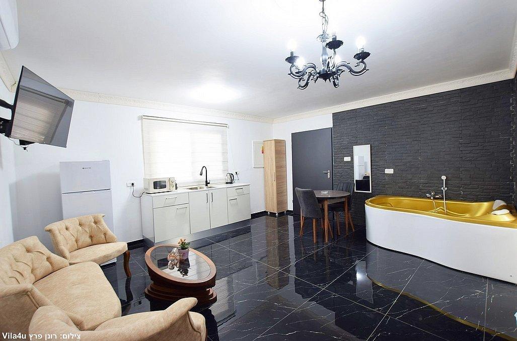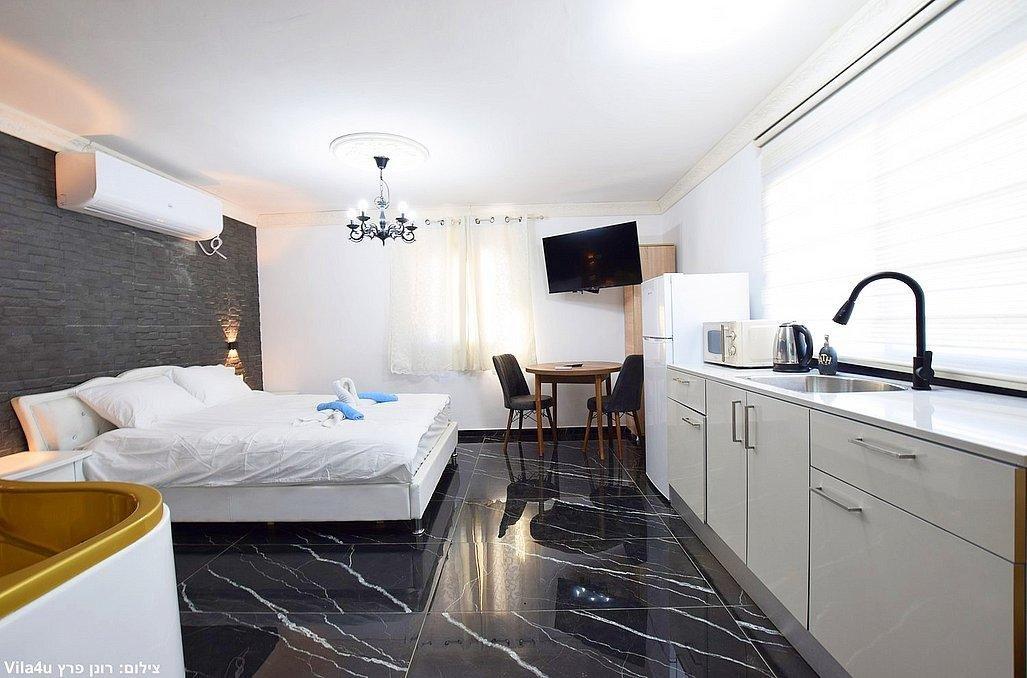 מיטה זוגית, ג'קוזי זוגי גדול, שידה וארון, מיזוג אוויר, מסך LCD עם חיבור להוט, פינת אוכל, מטבחון מאובזר, חדר רחצה פרטי הכולל מקלחון ושירותים