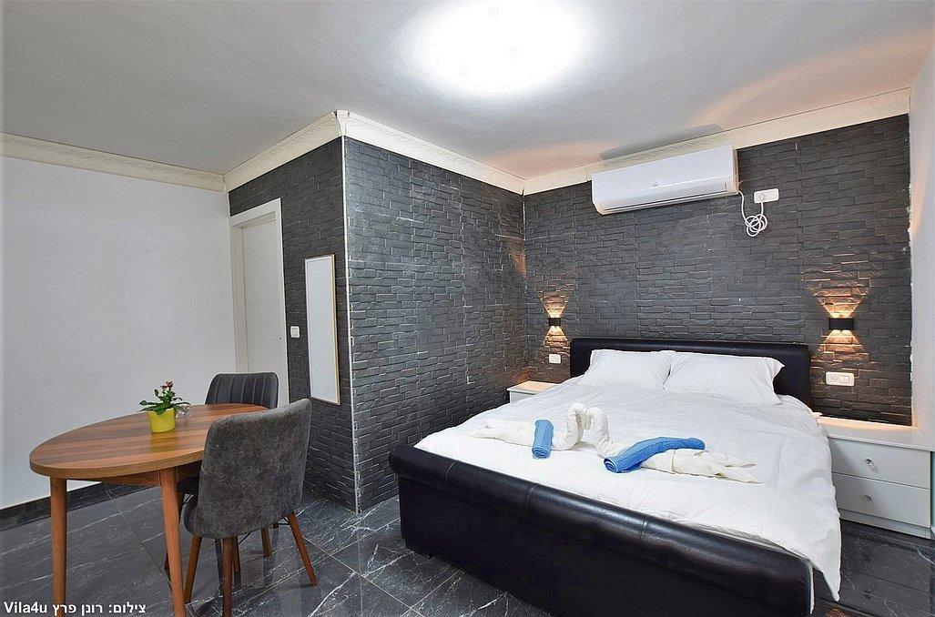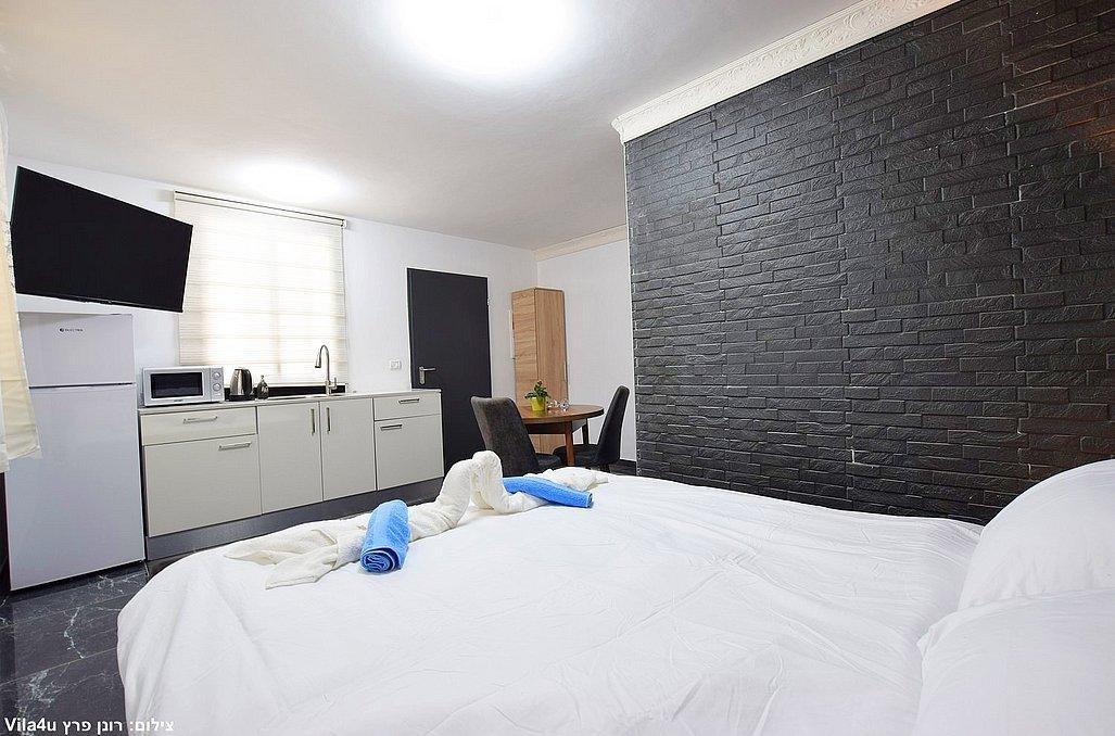 מיטה זוגית, שידה וארון, מיזוג אוויר, מסך LCD עם חיבור להוט, פינת אוכל, מטבחון מאובזר, חדר רחצה פרטי הכולל מקלחון ושירותים
