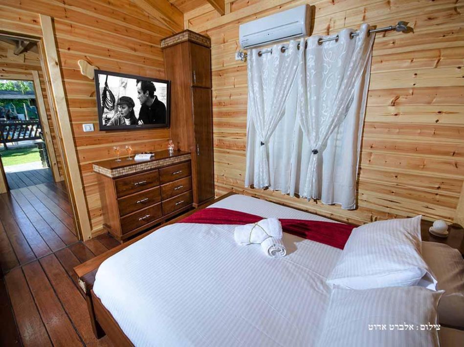 -חדר שינה פרטי עם דלת הכולל: מיטה זוגית מרווחת, טלוויזיה רחבה ומיזוג אוויר.