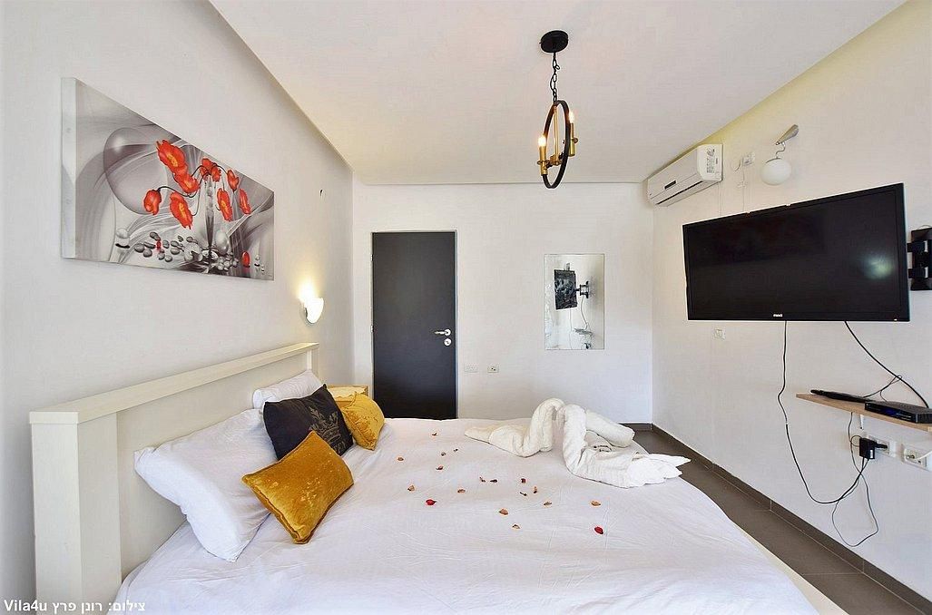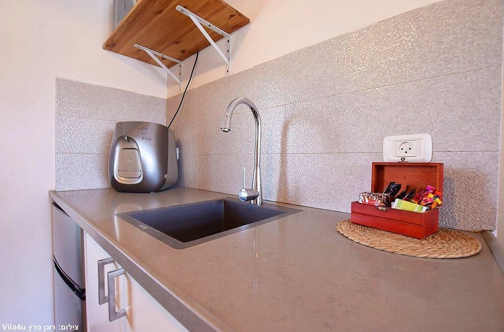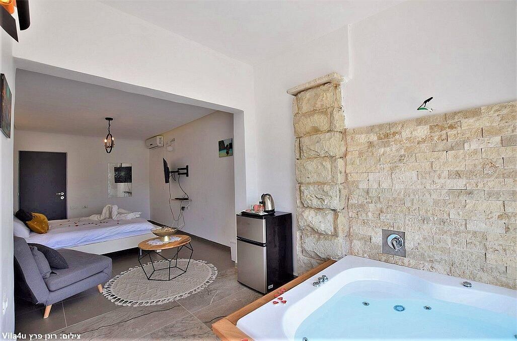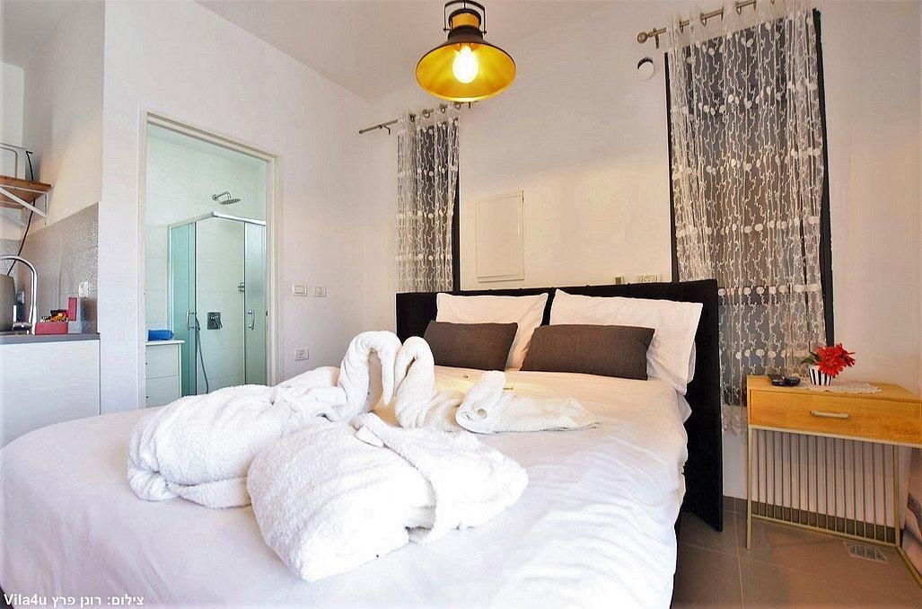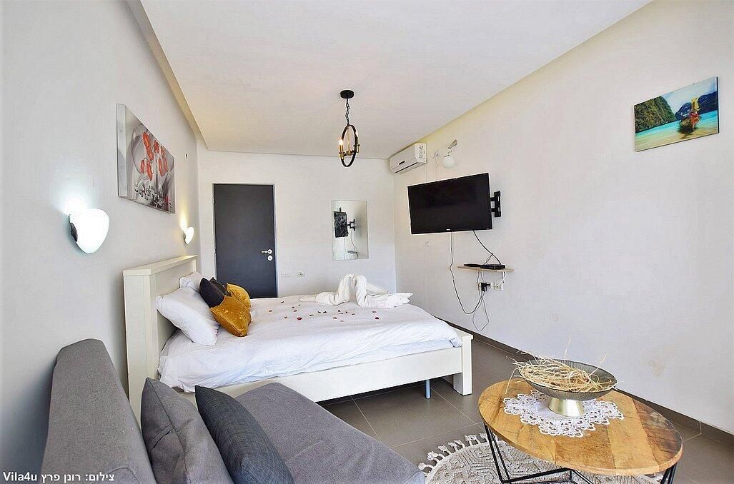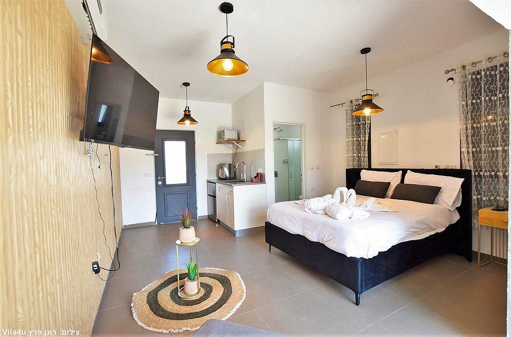 בכל סוויטה מיטה זוגית מפנקת, חדר רחצה, פינת ישיבה נוחה, פינת אוכל, טלוויזיה עם חיבור לYES, מזגן, מקרר, מיקרוגל ופינת קפה