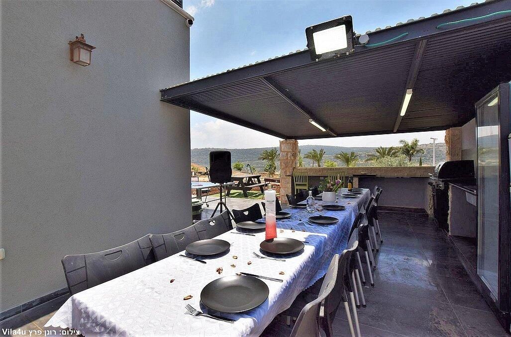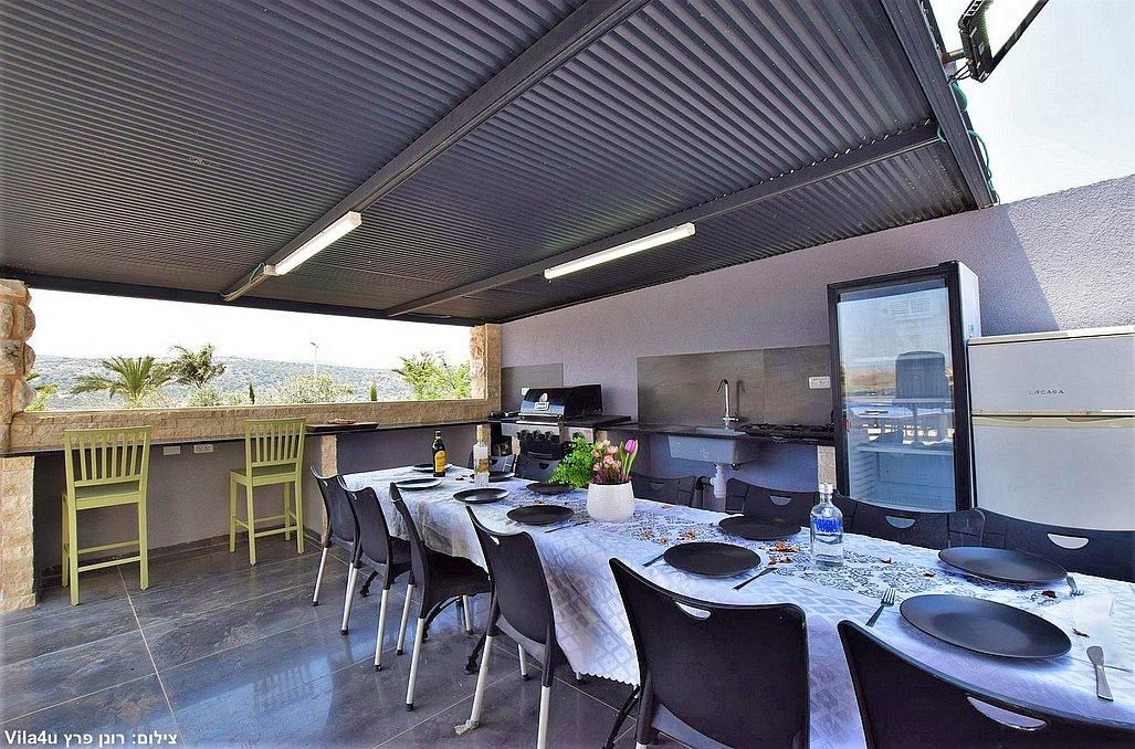 סביב הבריכה תהנו ממיטות שיזוף, פינות ישיבה, ערסל ומטבח ענק עם מנגל פחמים ופינת אוכל שתוכלו לסעוד את הארוחות שלכם.