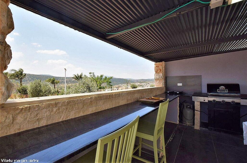 המטבח כולל: מקרר, מקרר שתיה, תנור אפייה, כיריים גז, מנגל פחמים, כיור ובר עם כסאות הצופה אל הנוף.