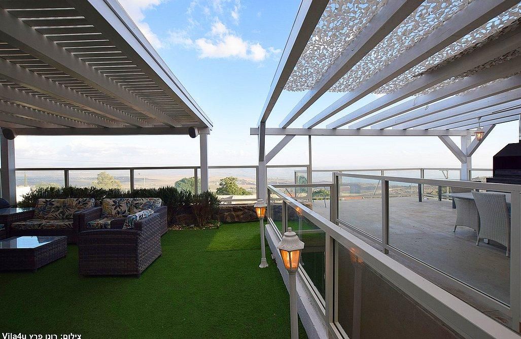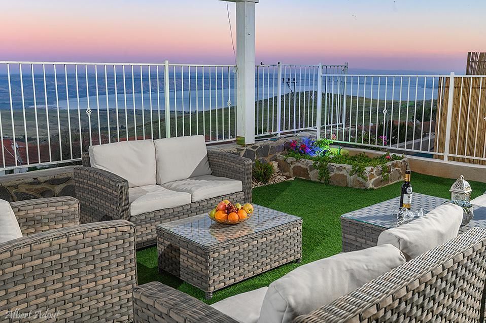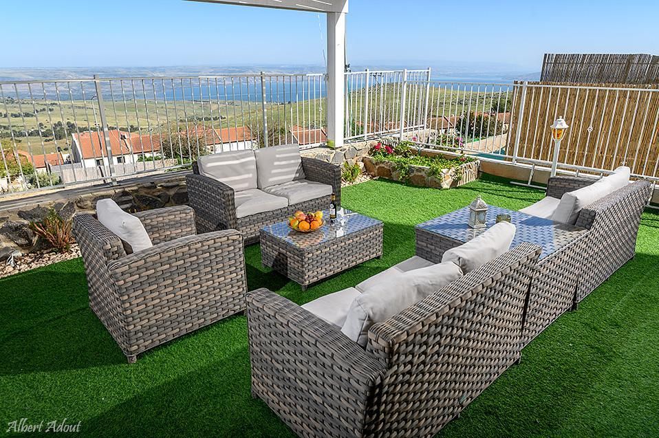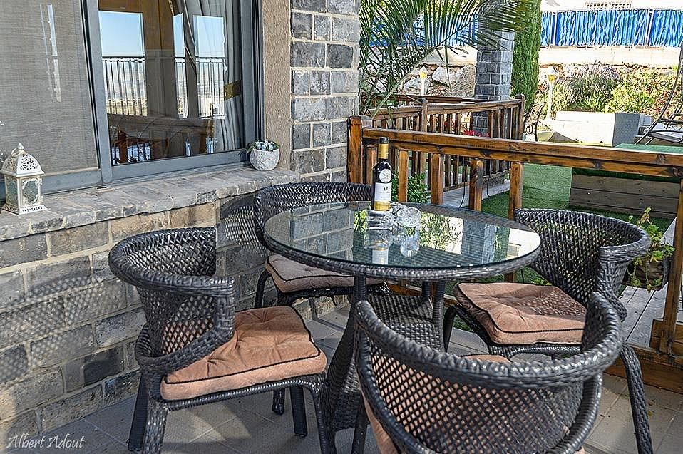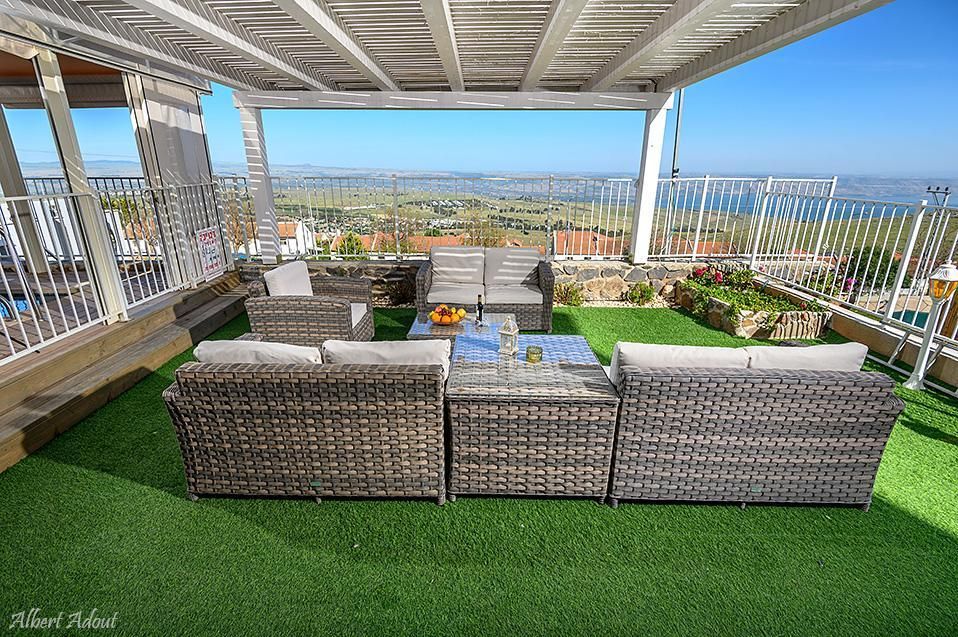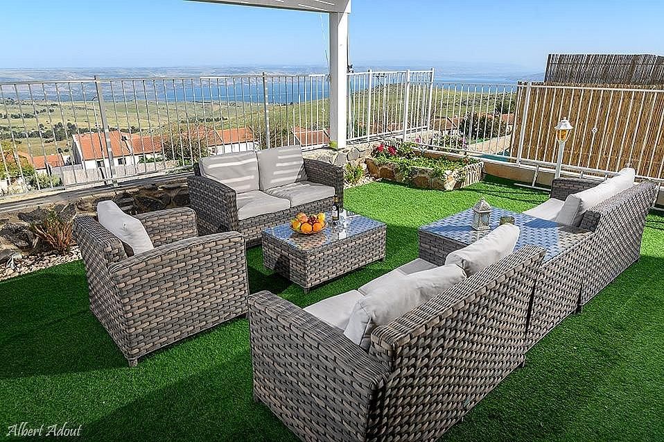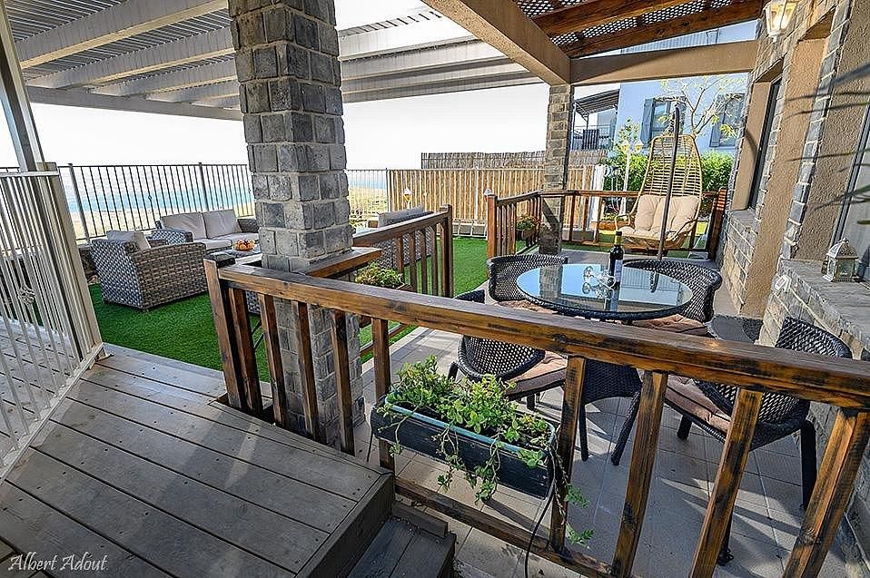 שולחן אוכל ומרפסת עץ פרטית הצופה לנוף פנורמי, שולחן קפה וערסל