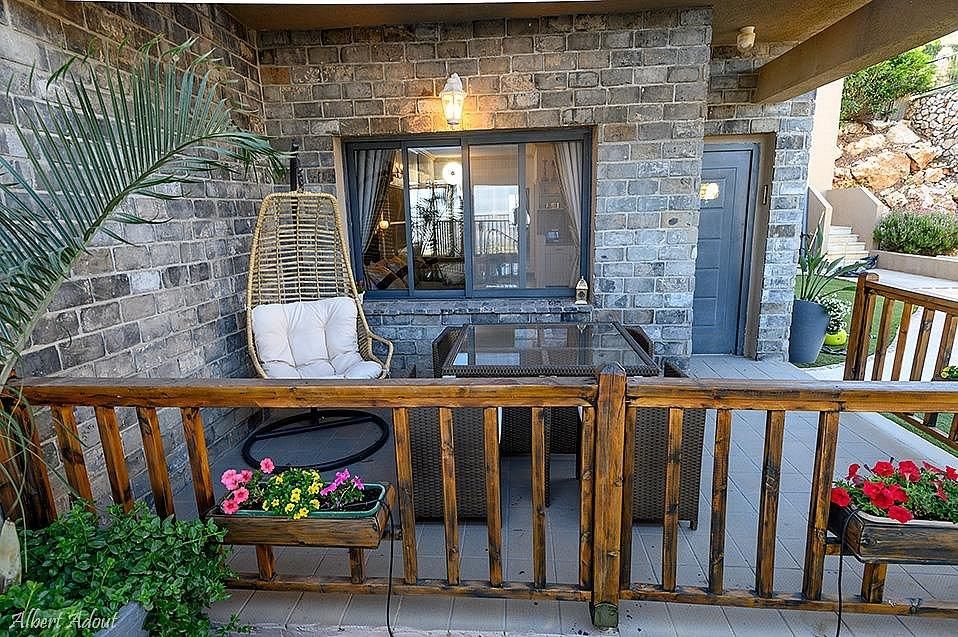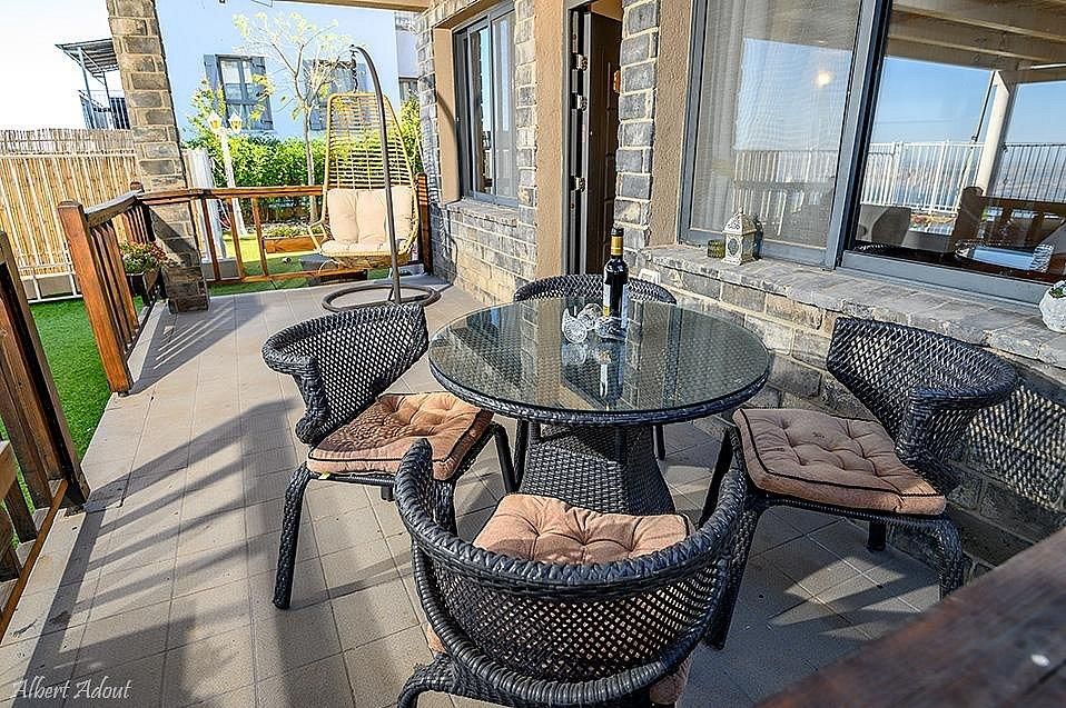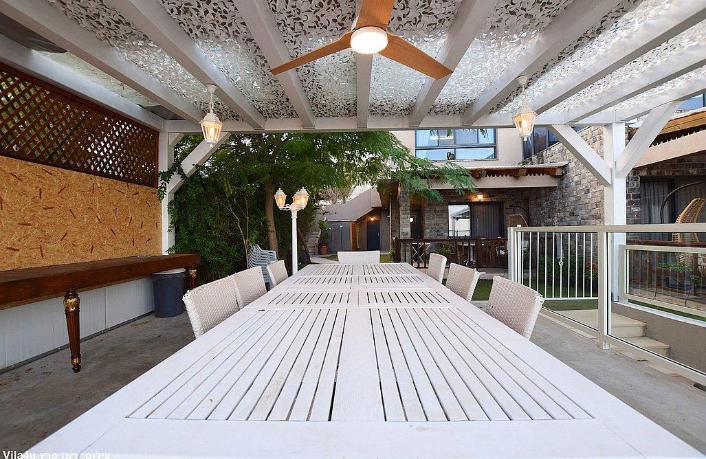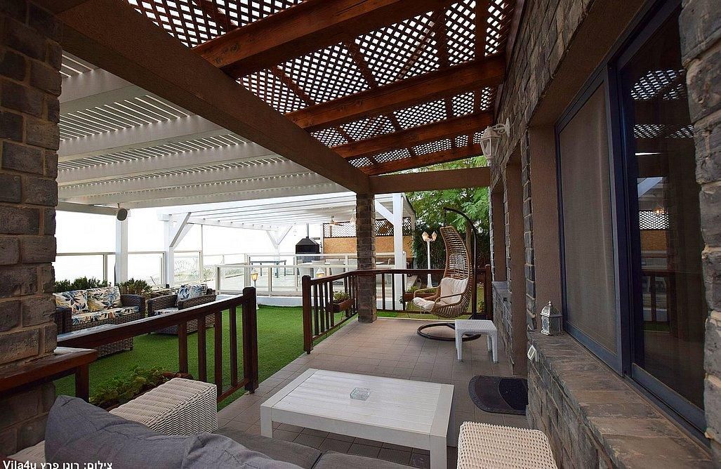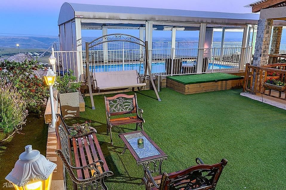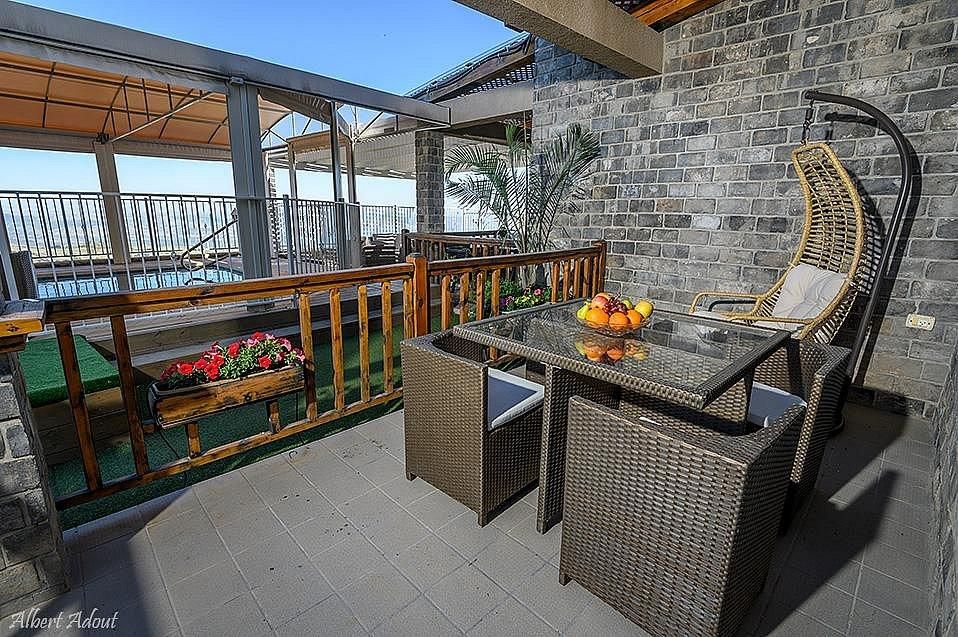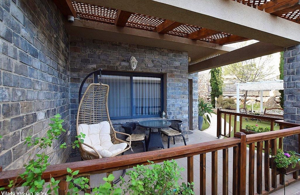 שולחן אוכל ומרפסת עץ פרטית הצופה לנוף פנורמי, שולחן קפה וערסל