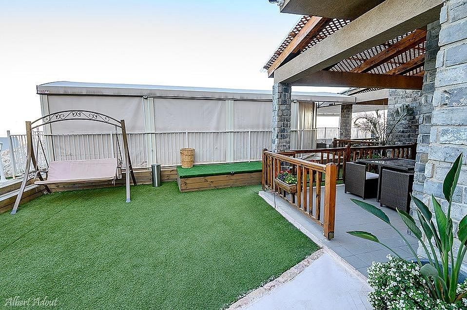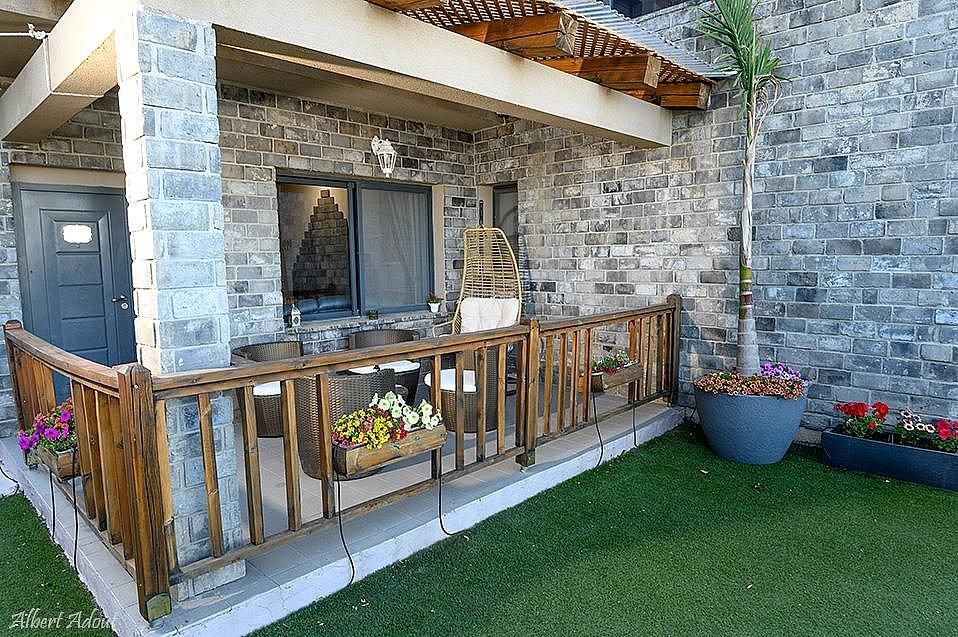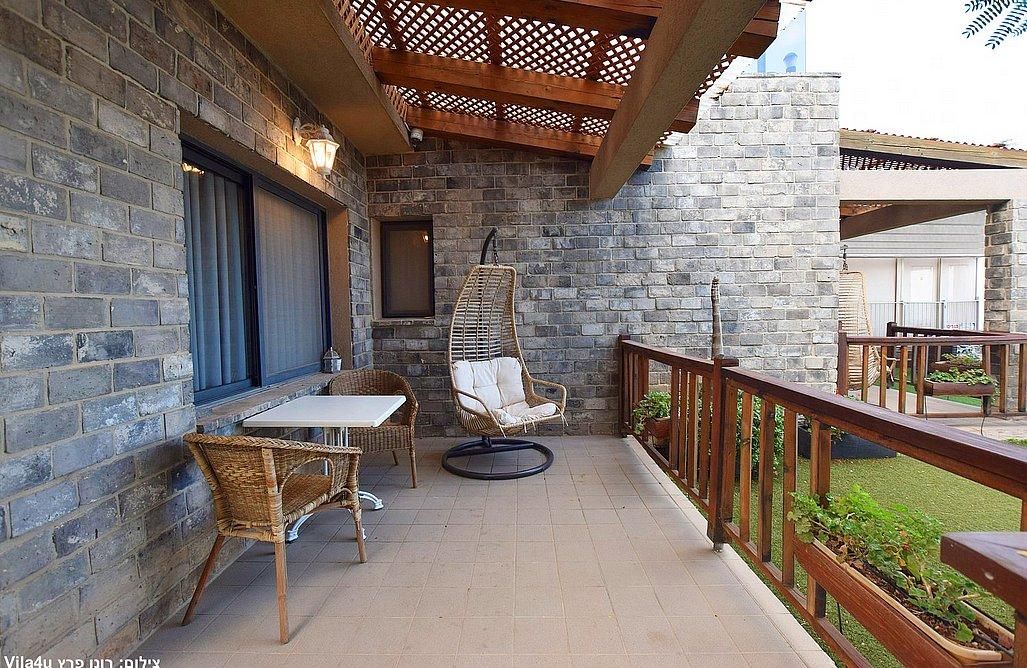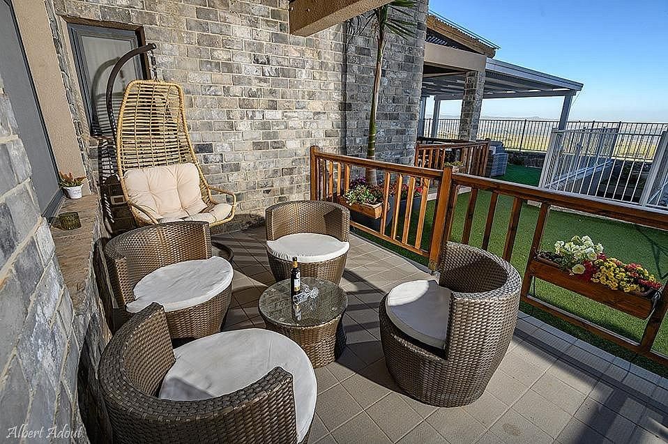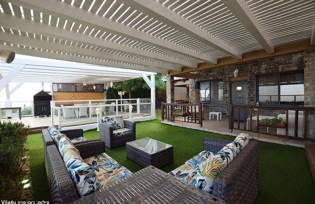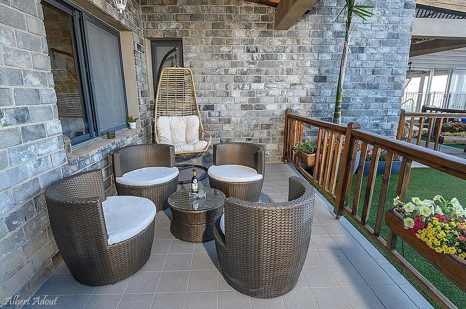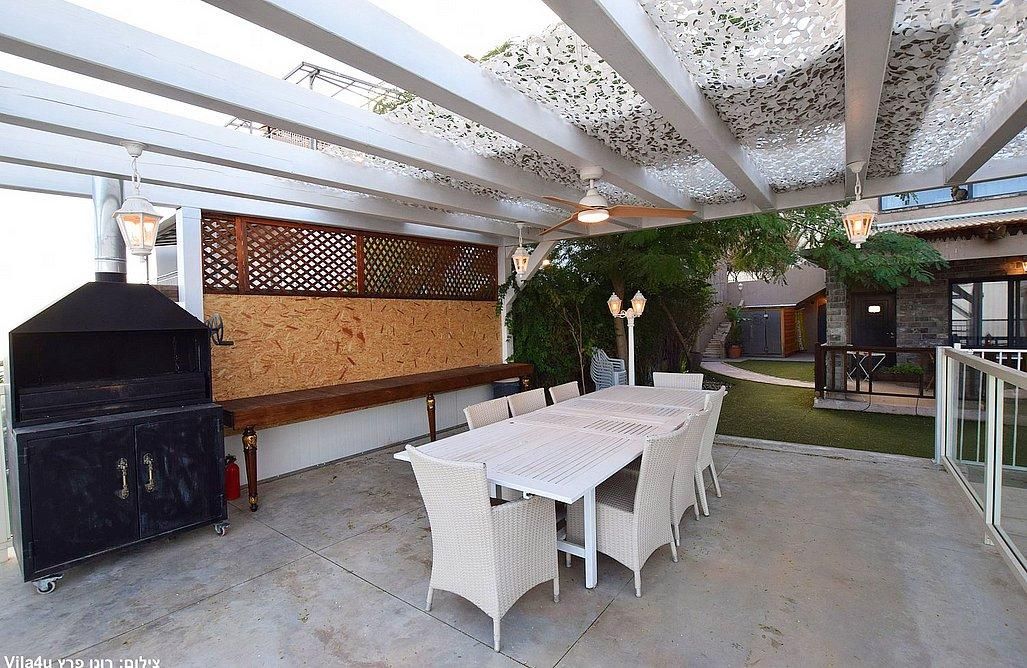 שולחן אוכל ומרפסת עץ פרטית הצופה לנוף פנורמי, שולחן קפה וערסל
