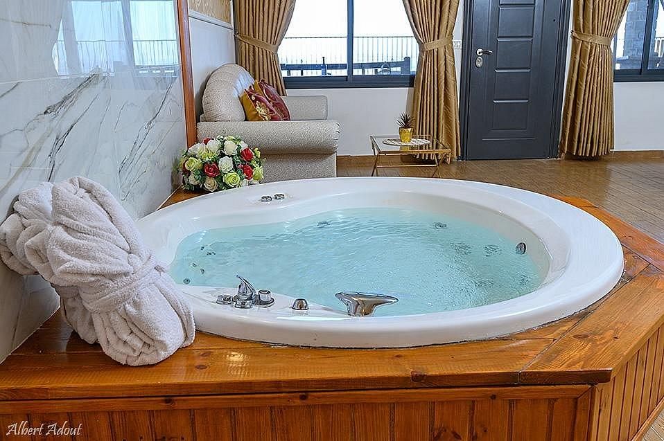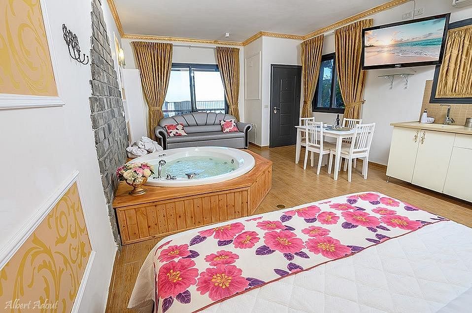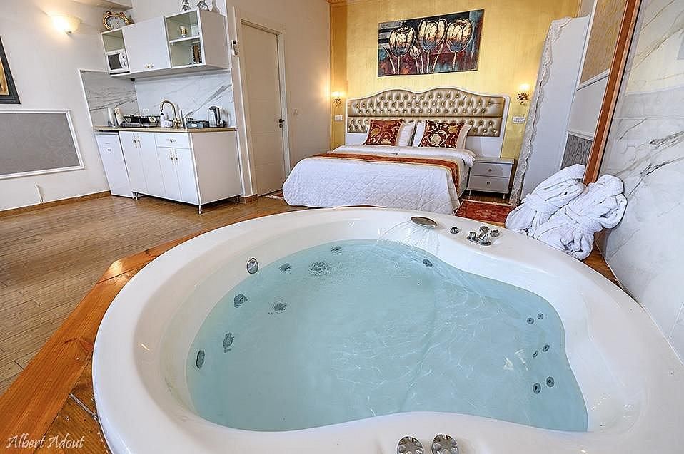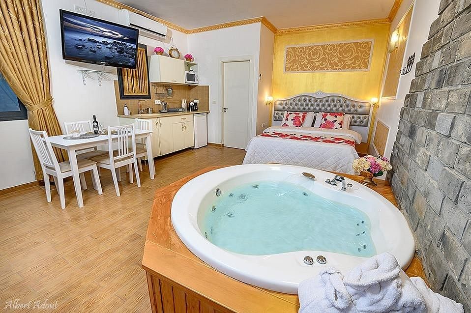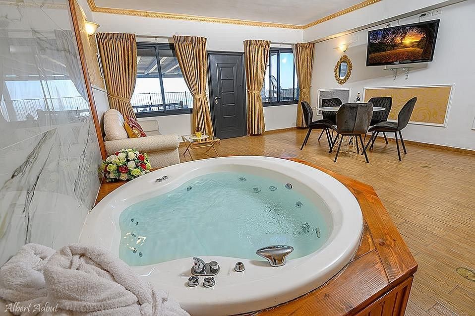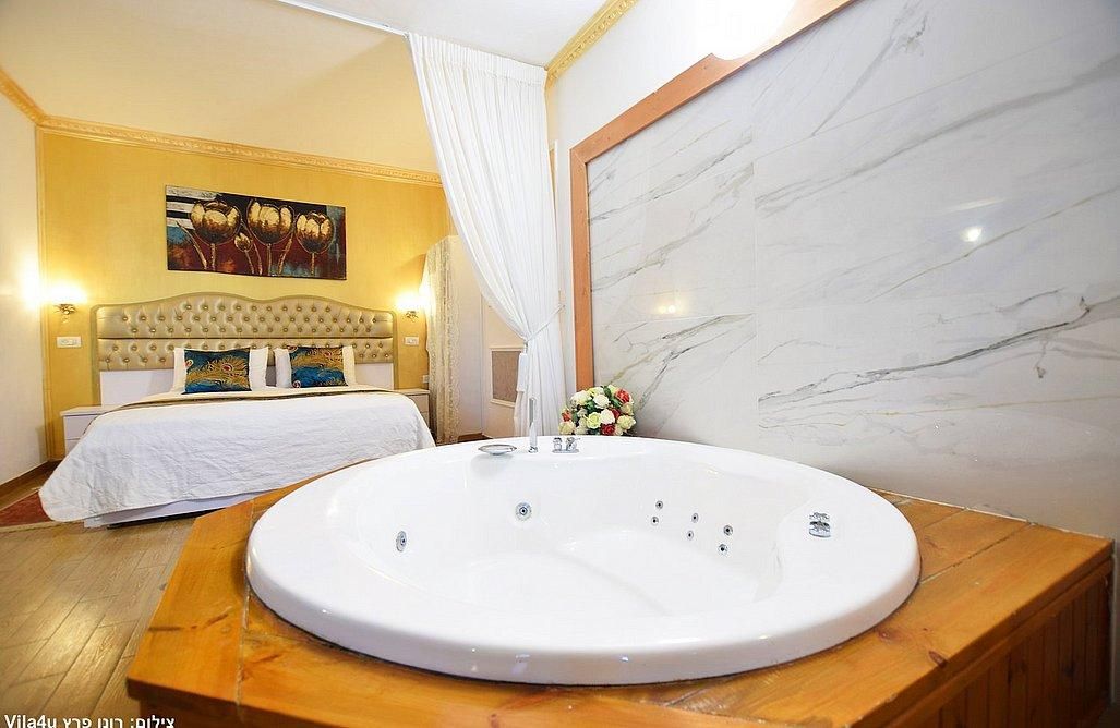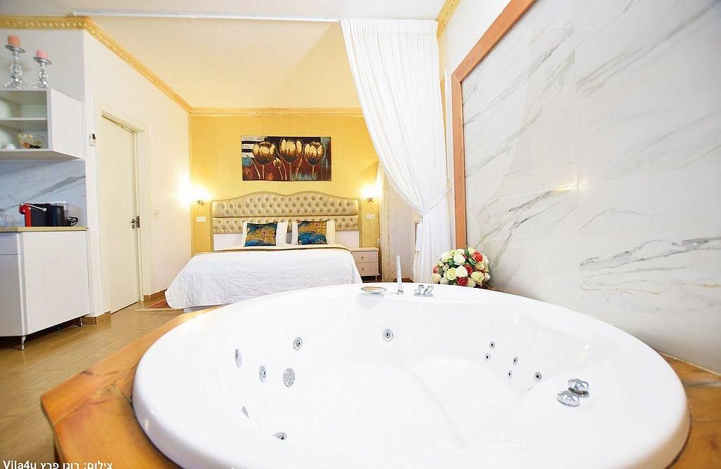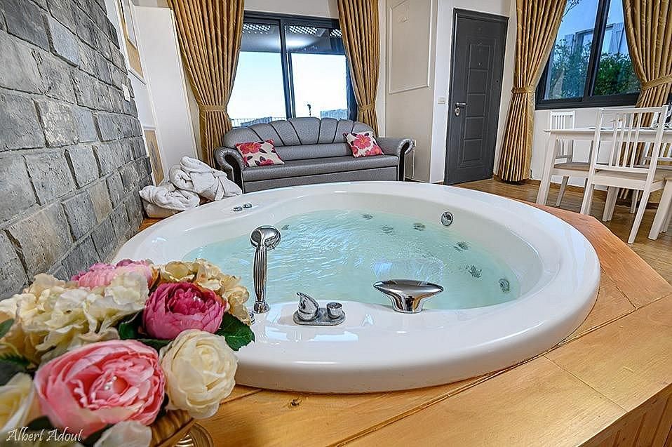 ג'קוזי גדול במרכז החדר (קיים ב3 סוויטות), מואר בתאורת לד המתחברת לרמקול בלוטות'