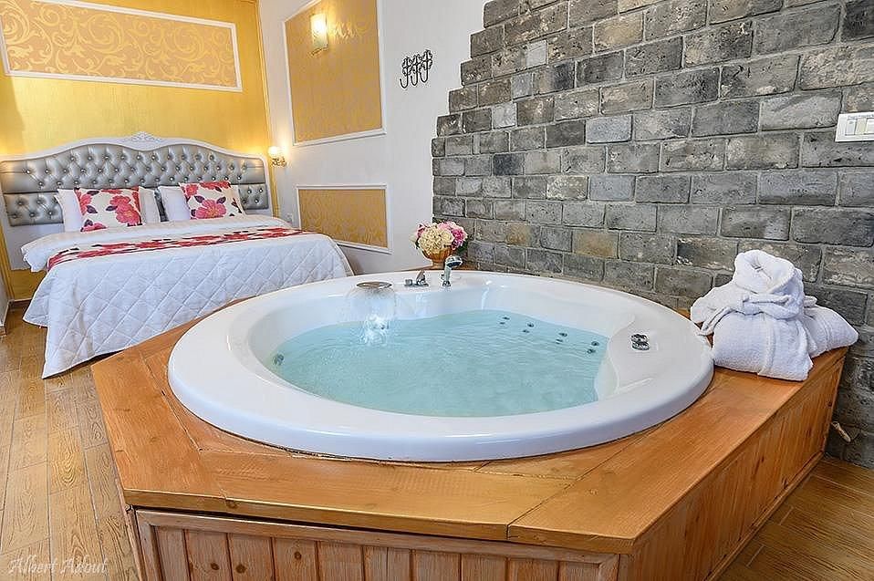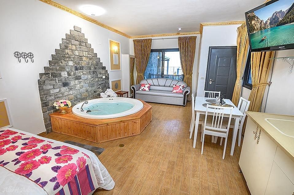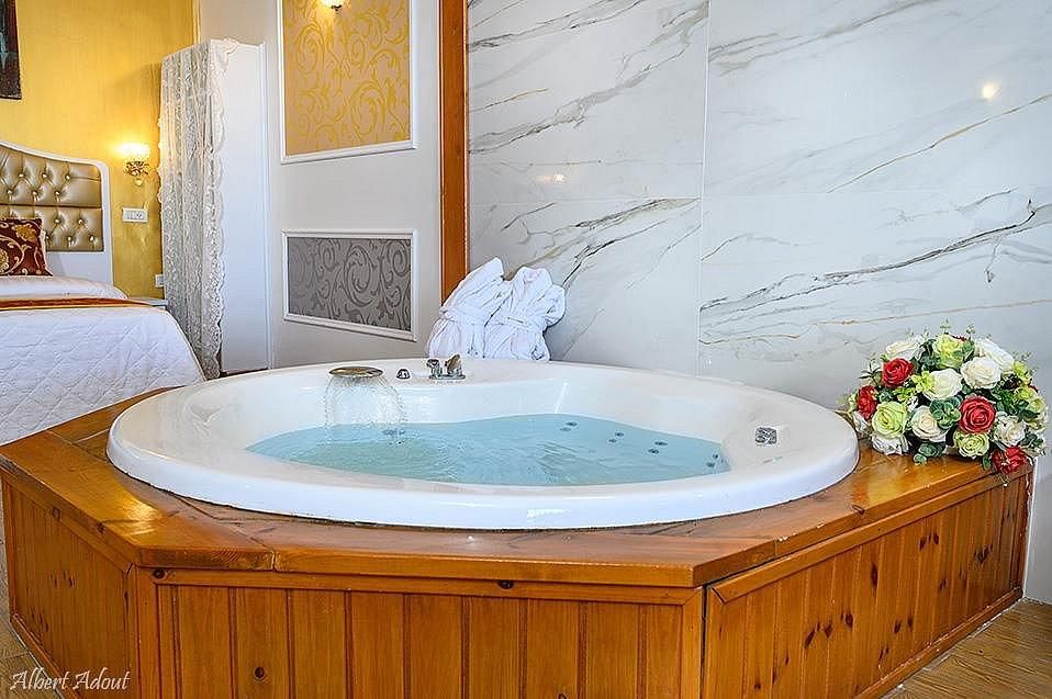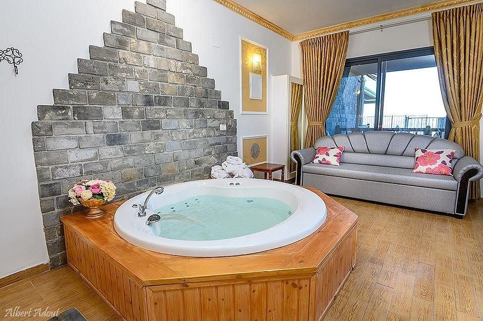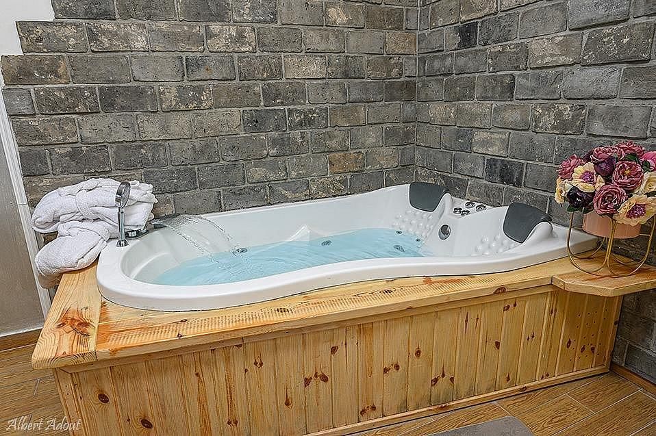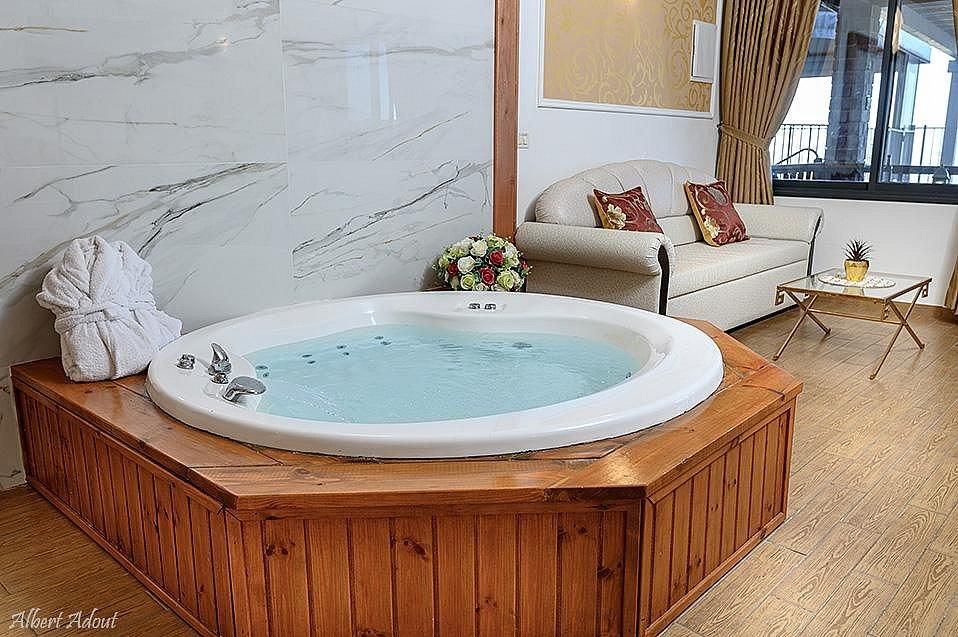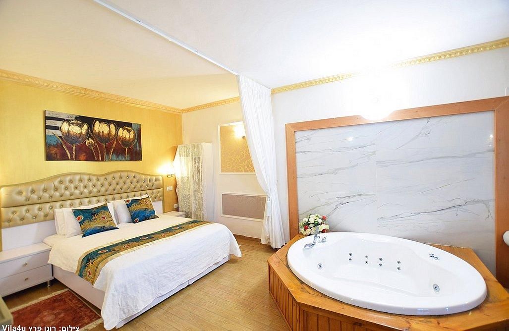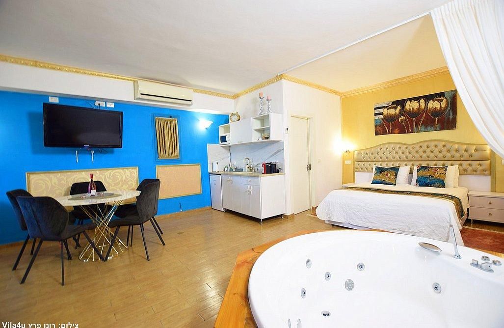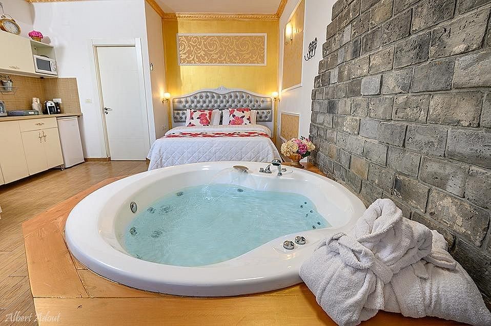 ג'קוזי גדול במרכז החדר (קיים ב3 סוויטות), מואר בתאורת לד המתחברת לרמקול בלוטות'