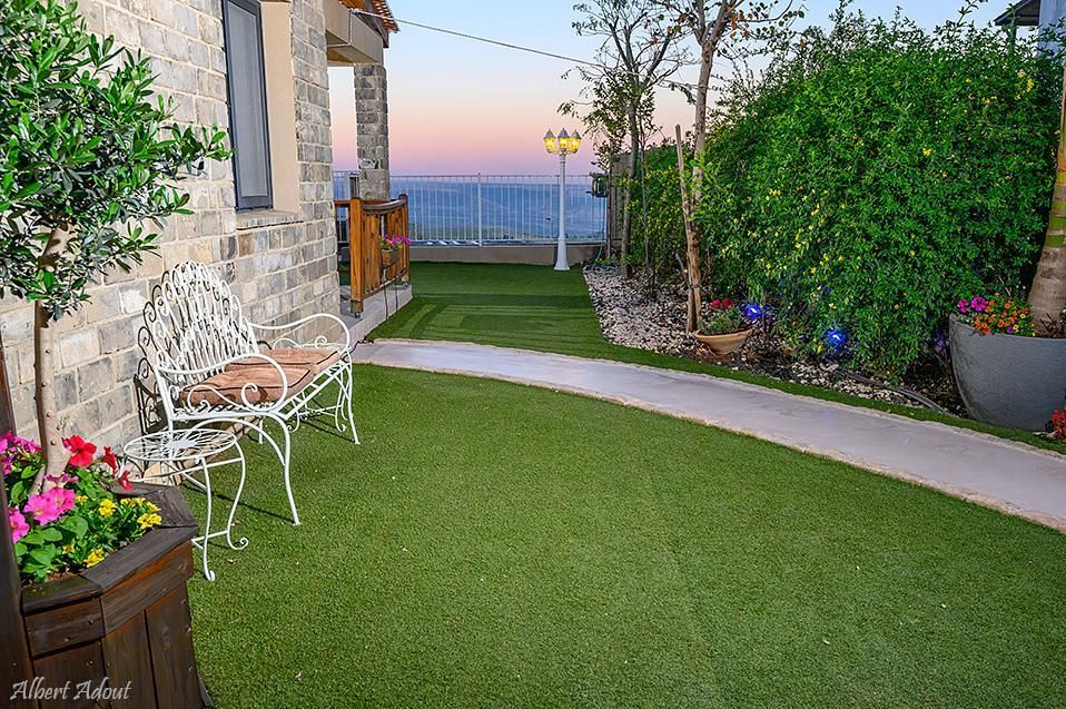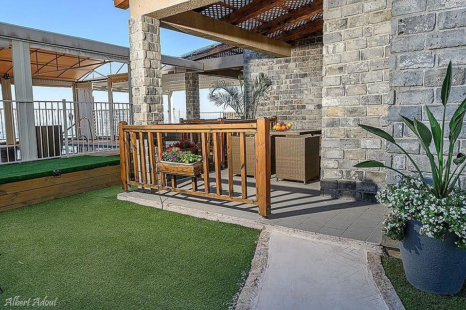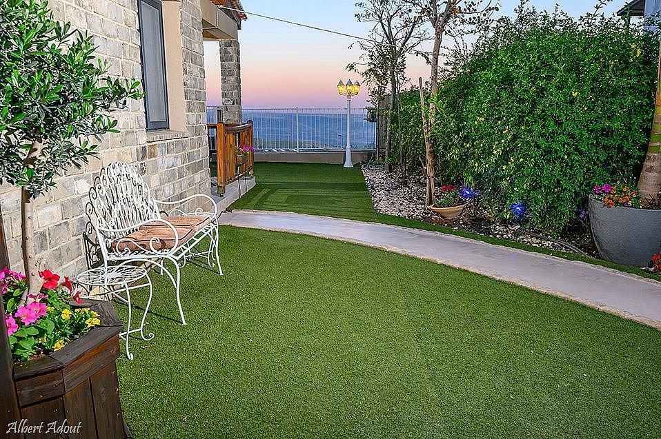סלון חוץ גדול, ערוגות נוי, ספסלים