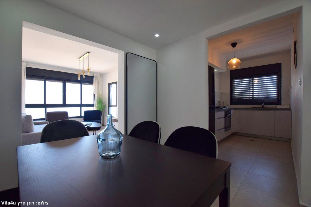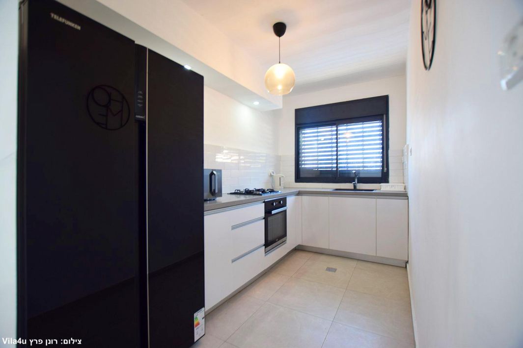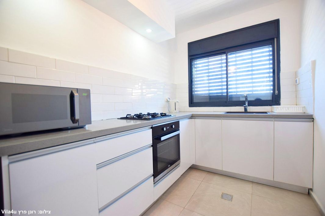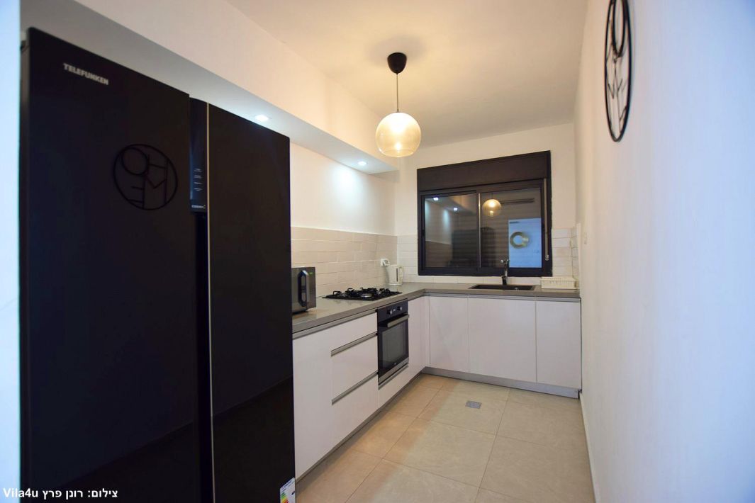 מטבח מאובזר ובו: מקרר, מיקרוגל, תנור אפייה, כיריים גז ופינת אוכל לצידו