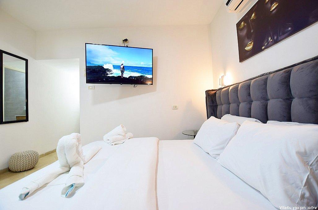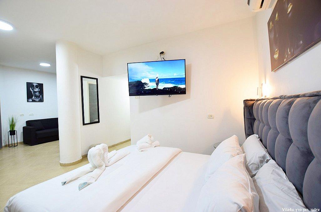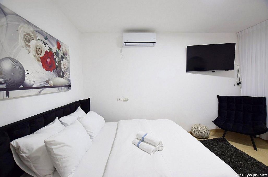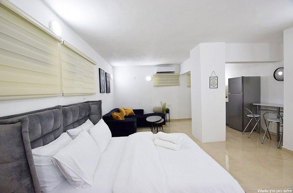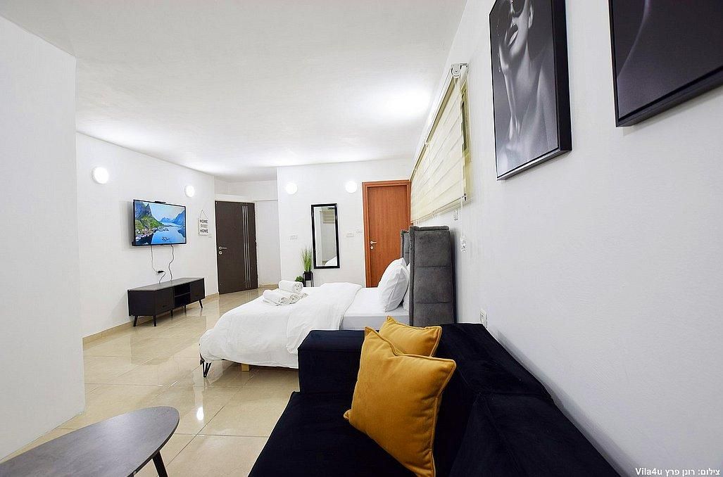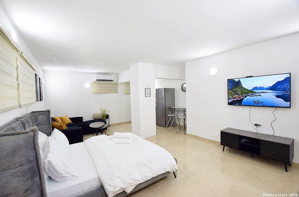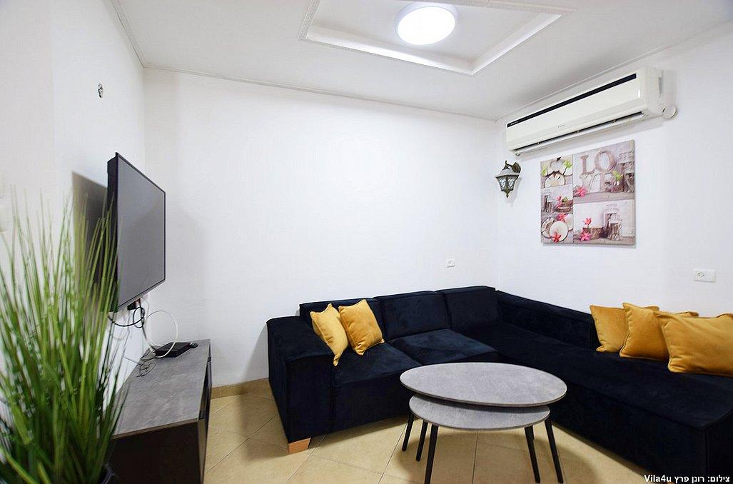 מיטה זוגית, טלוויזיה עם חיבור לכבלים, סלון עם ספה נפתחת, מטבח מאובזר, מיזוג אוויר ושידות לאחסון
