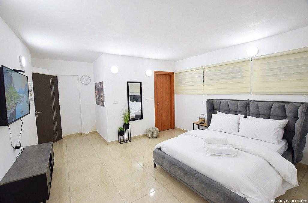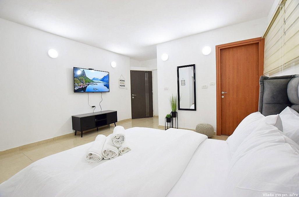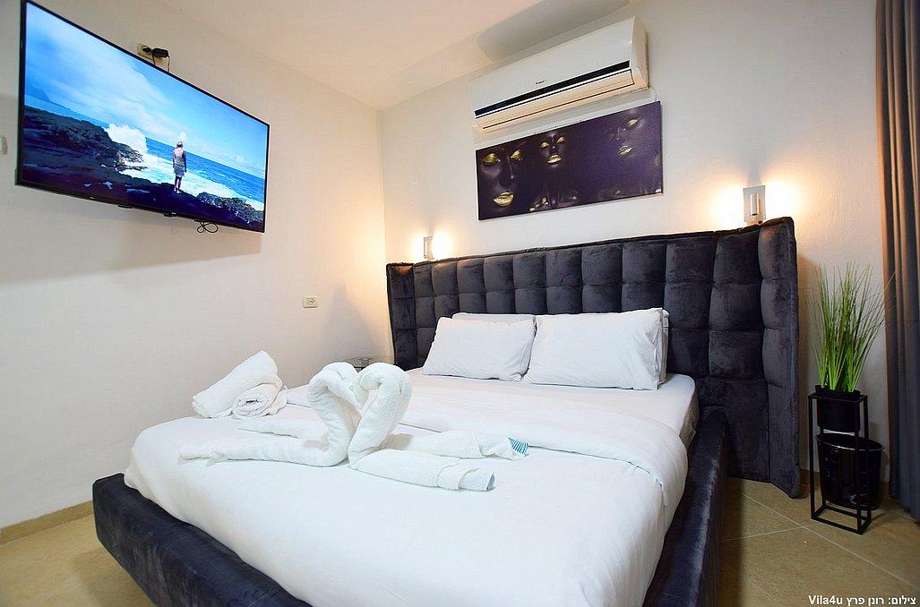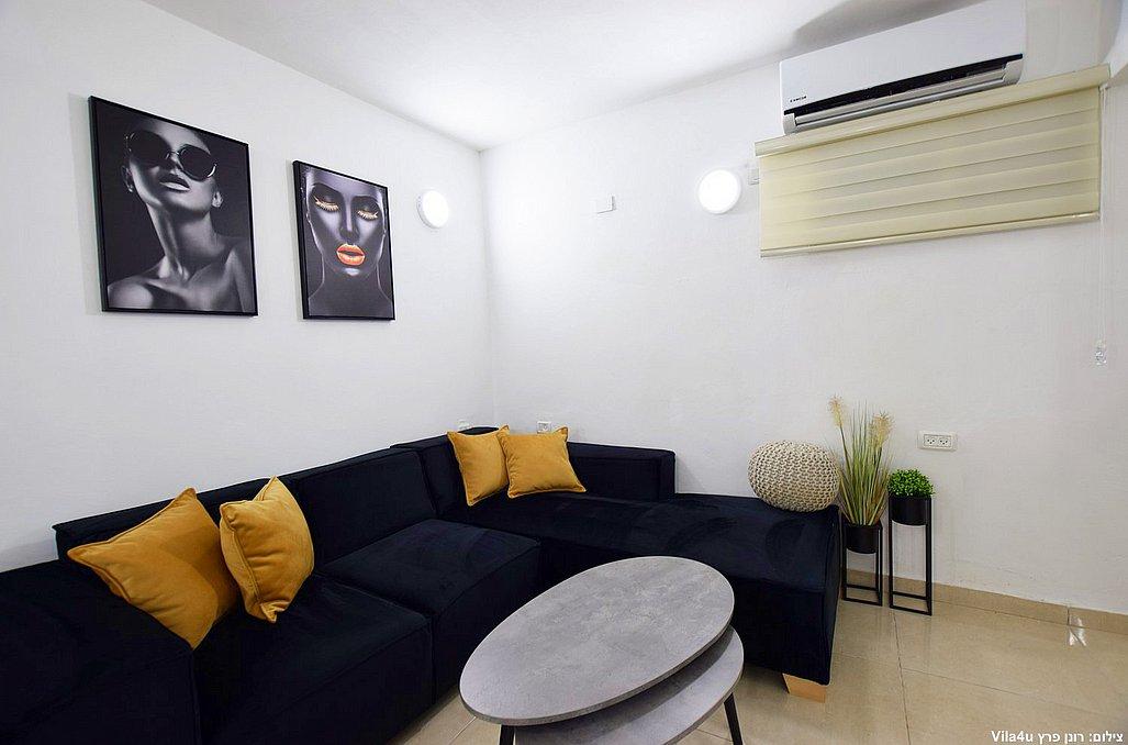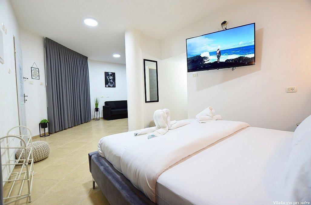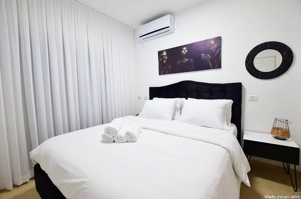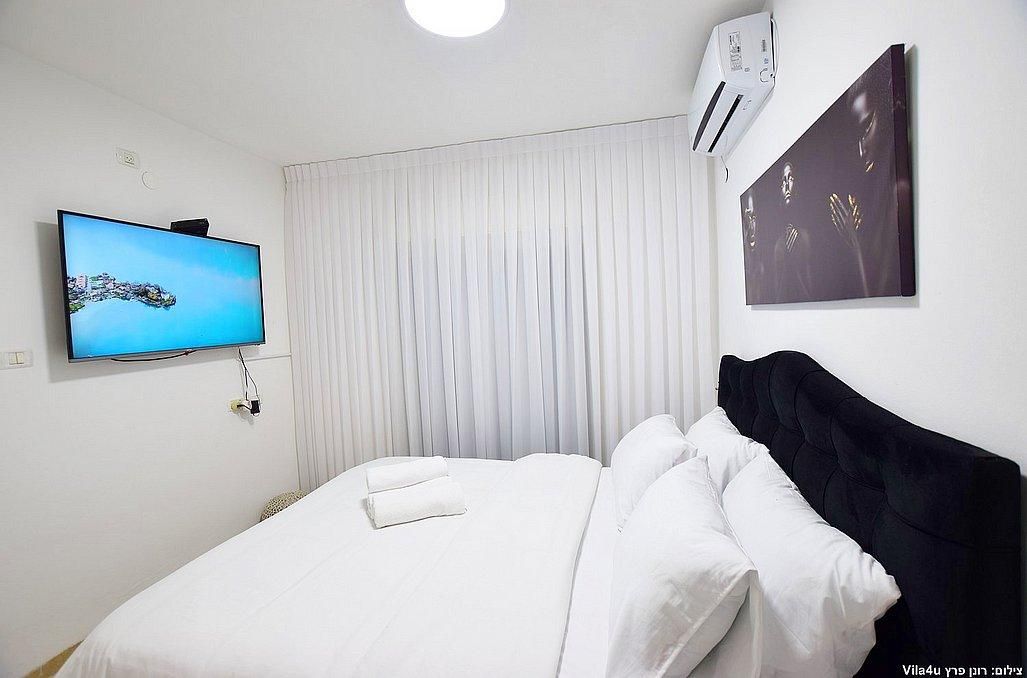 מיטה זוגית, טלוויזיה עם חיבור לכבלים, סלון עם ספה נפתחת, מטבח מאובזר, מיזוג אוויר ושידות לאחסון