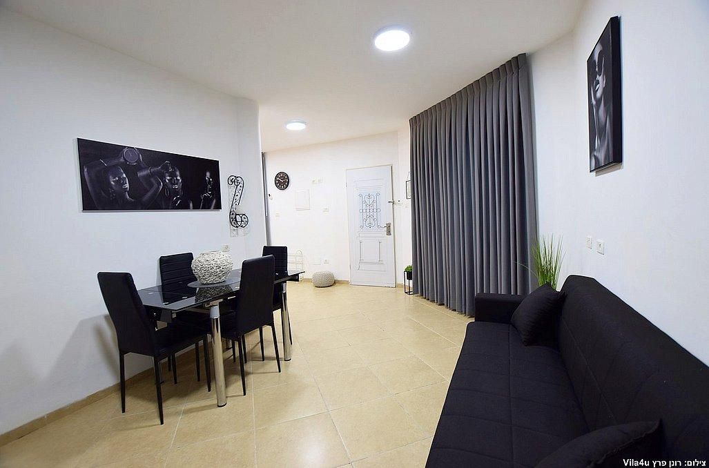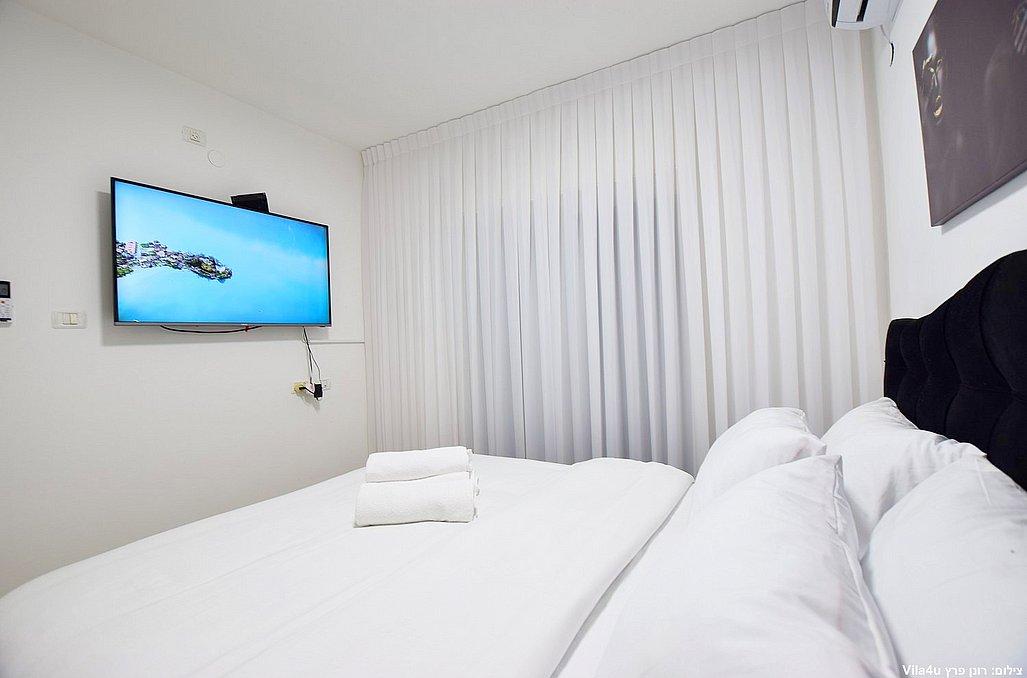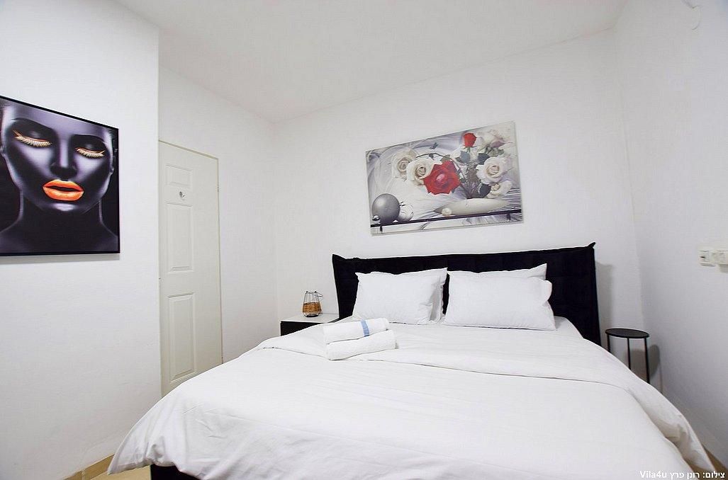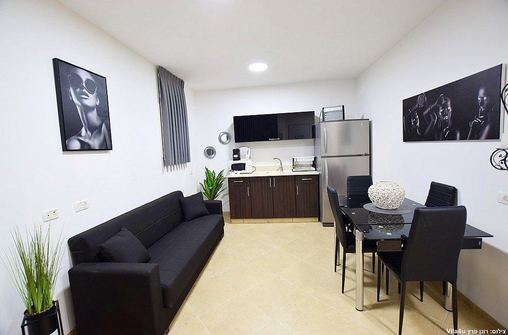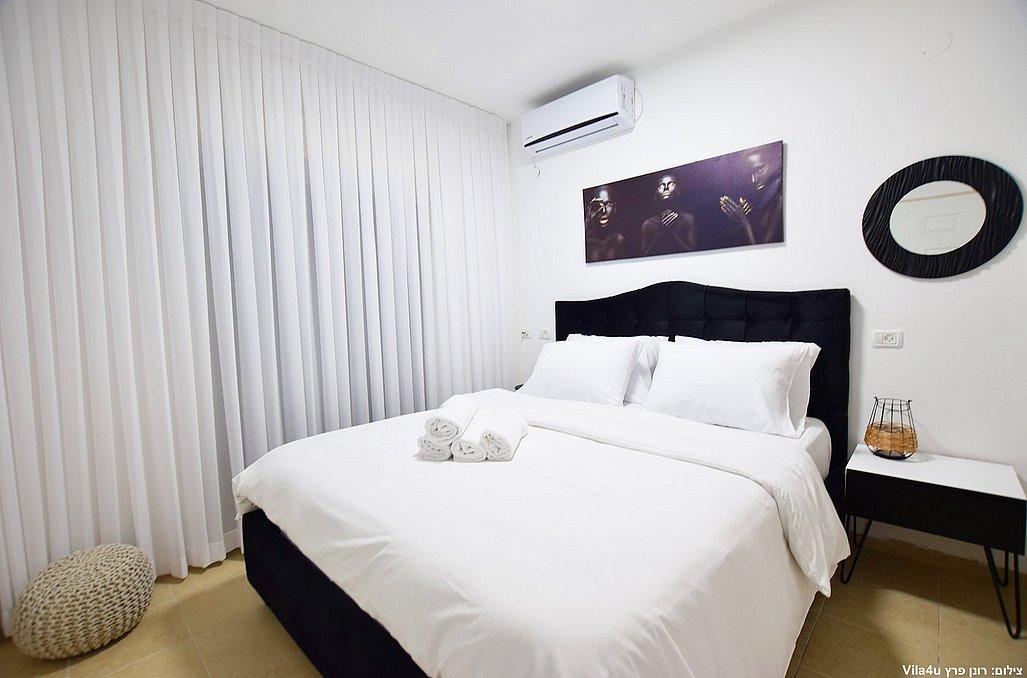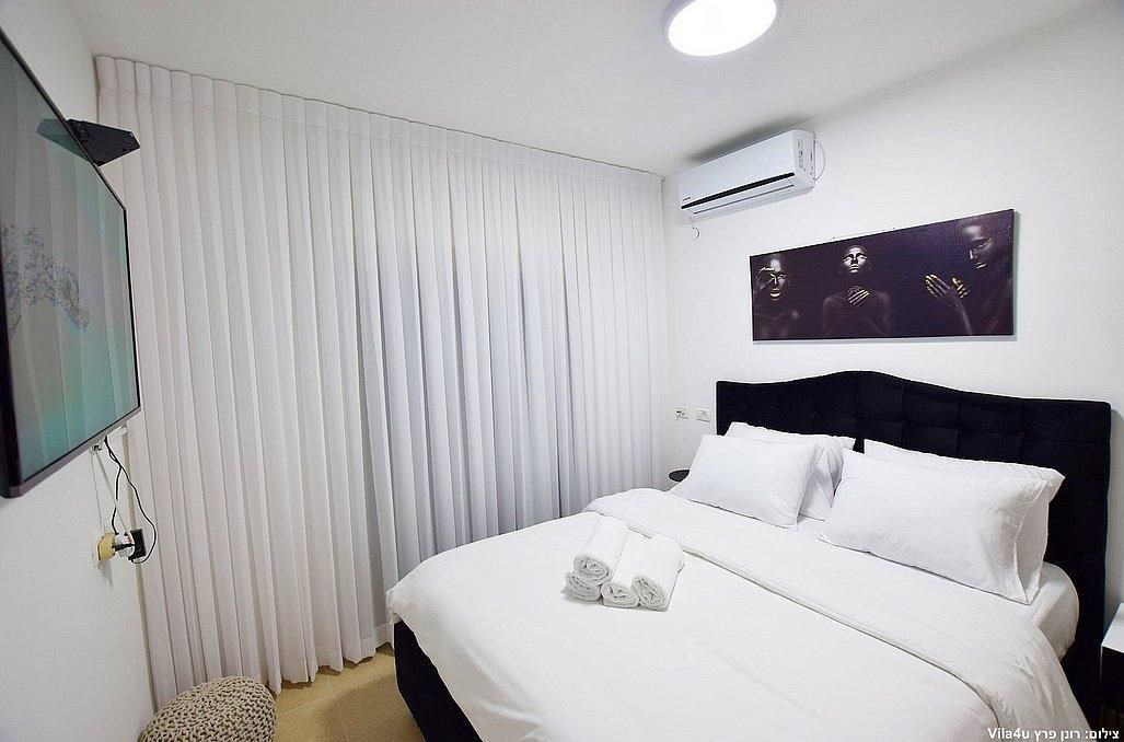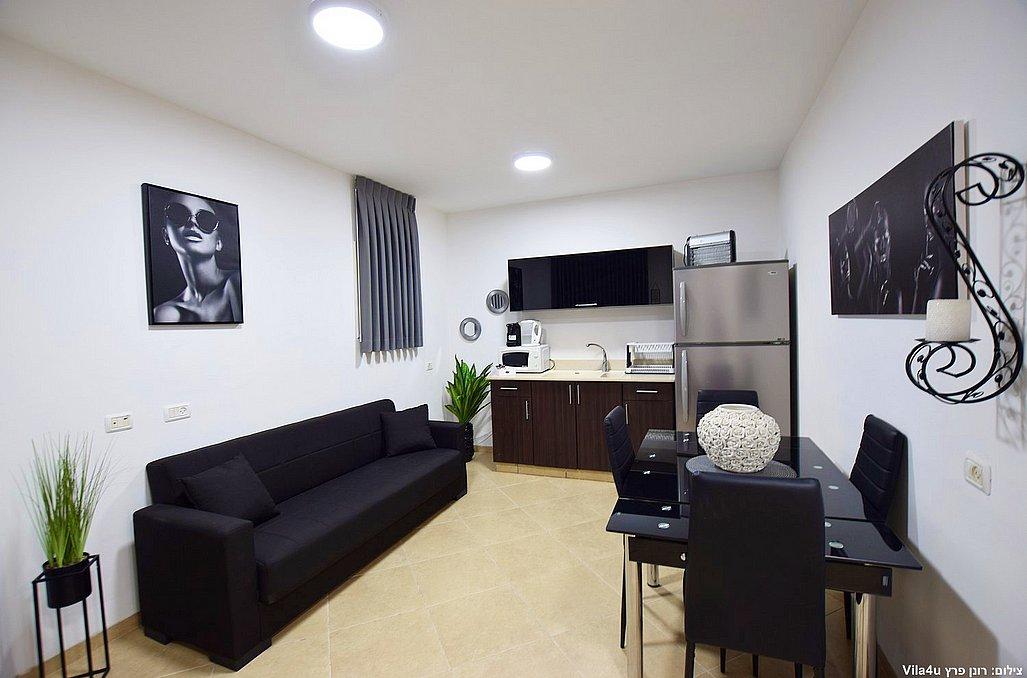 מיטה זוגית, טלוויזיה עם חיבור לכבלים, סלון עם ספה נפתחת, מטבח מאובזר, מיזוג אוויר ושידות לאחסון