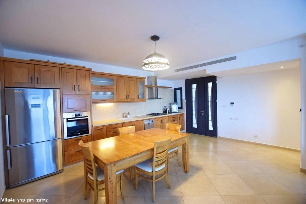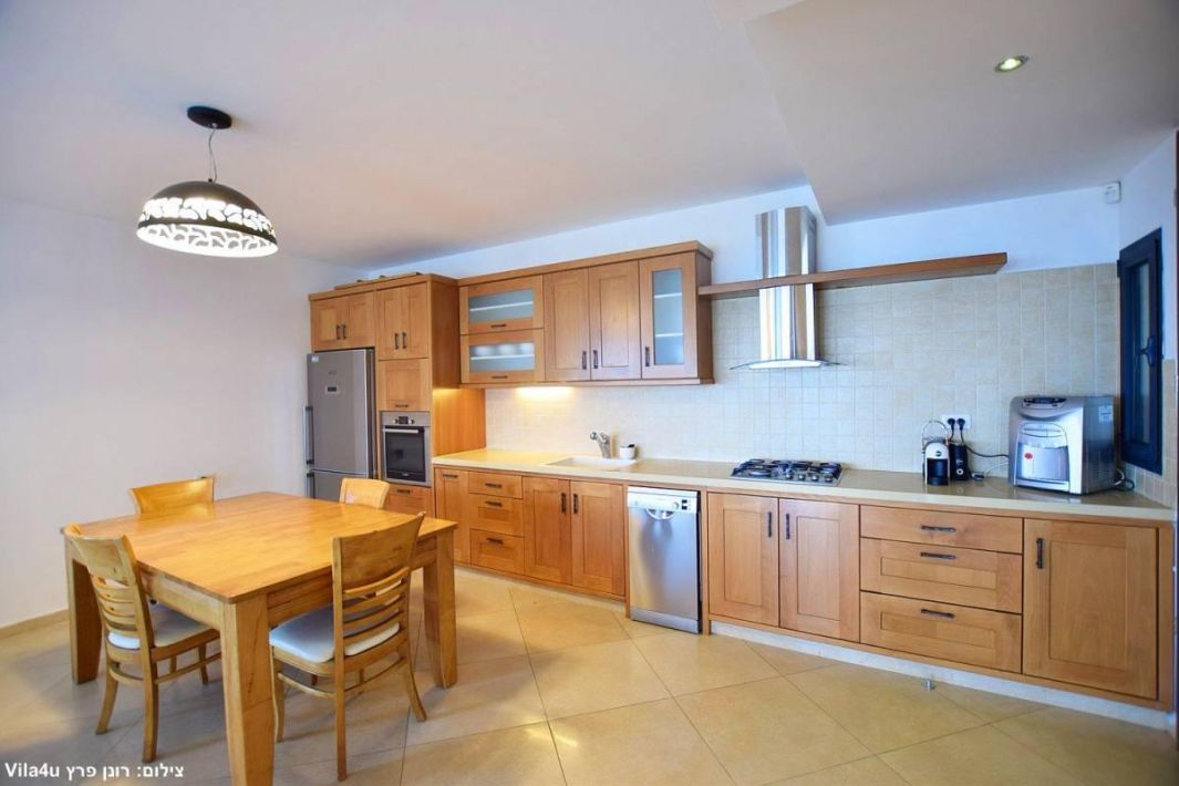 מטבח מאובזר הכולל: כיריים, תנור, מיקרוגל, בר מים, מקרר, מכונת קפה, כלי בישול והגשה.