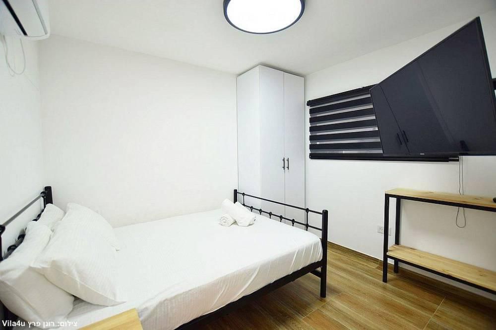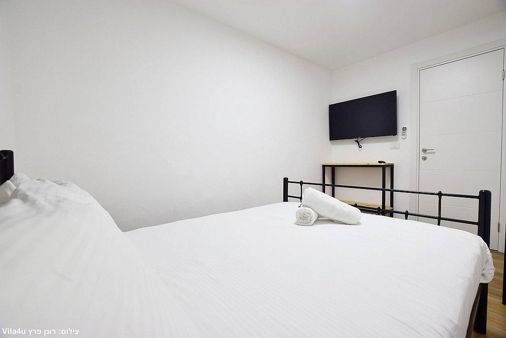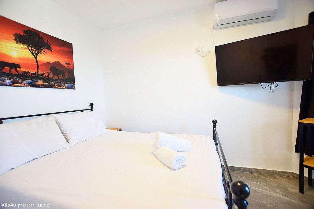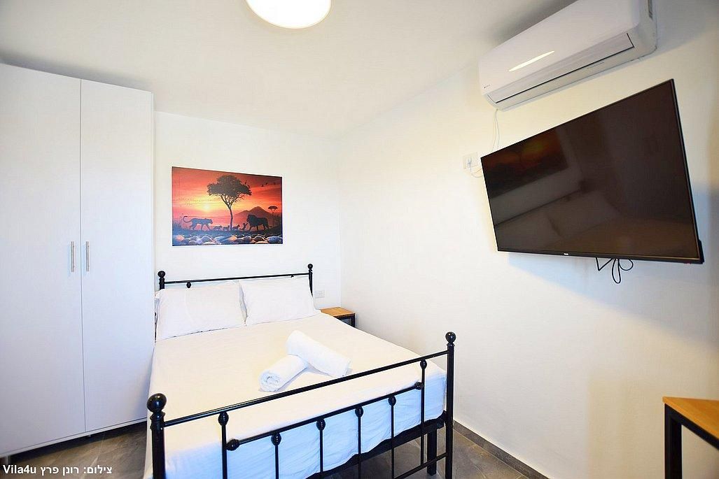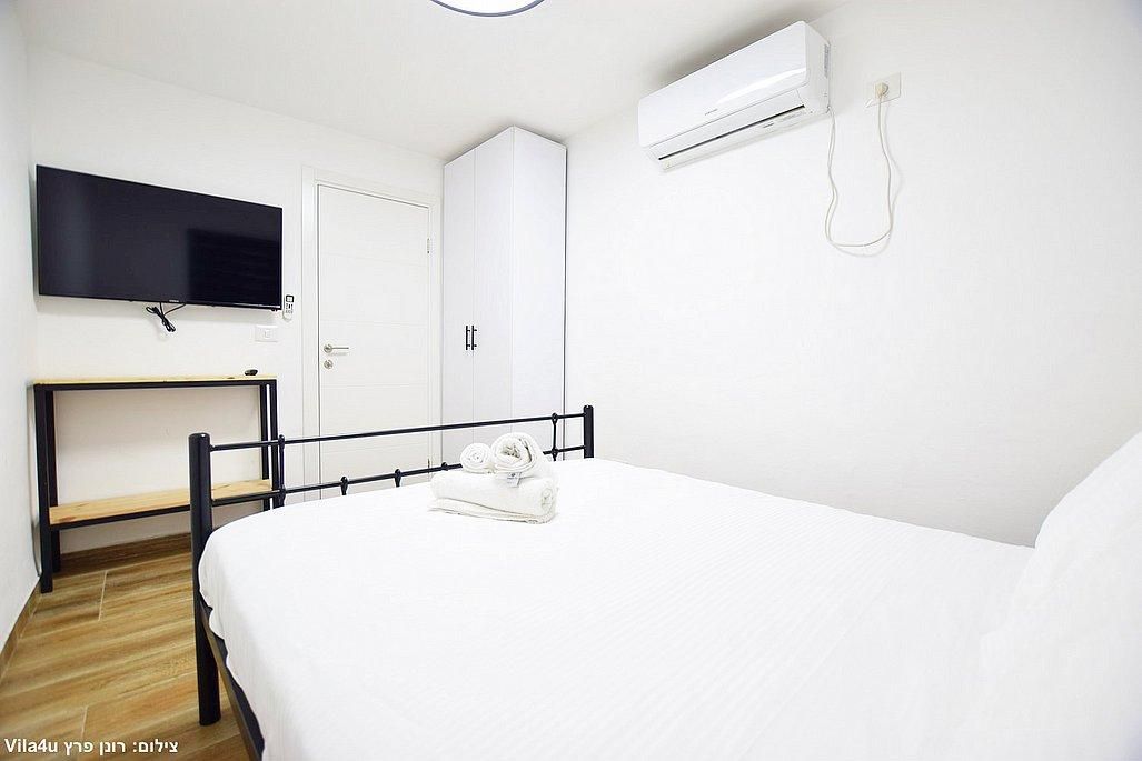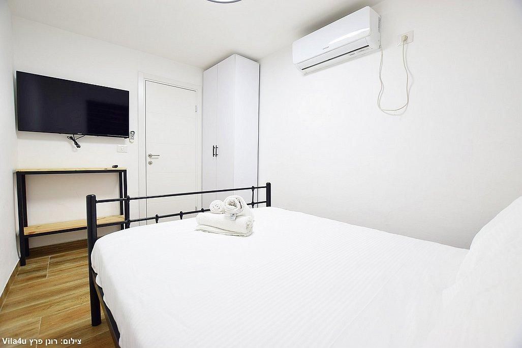 אבזור החדרים: מיטה זוגית, מזגן, טלוויזיה חכמה בגודל 43 אינץ', ארון אחסון.