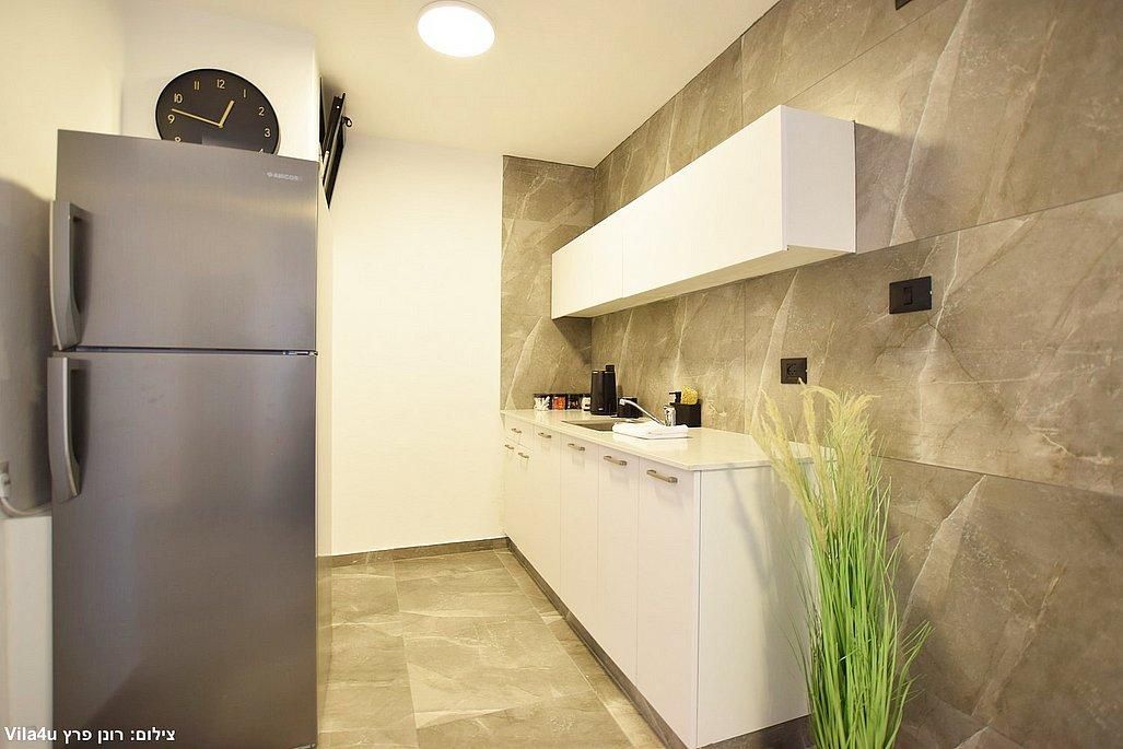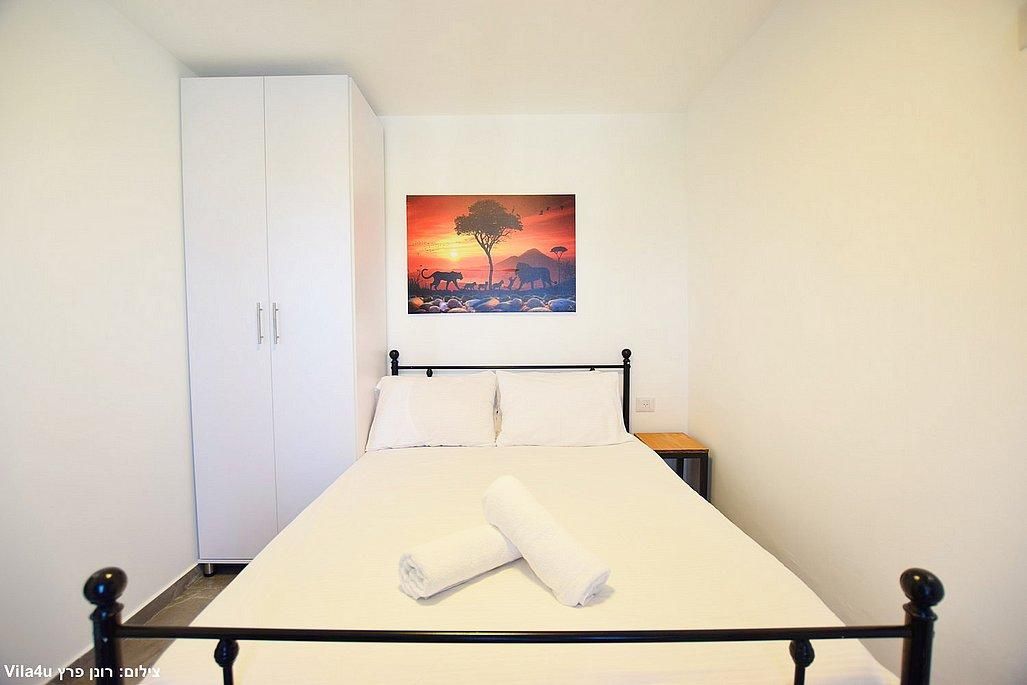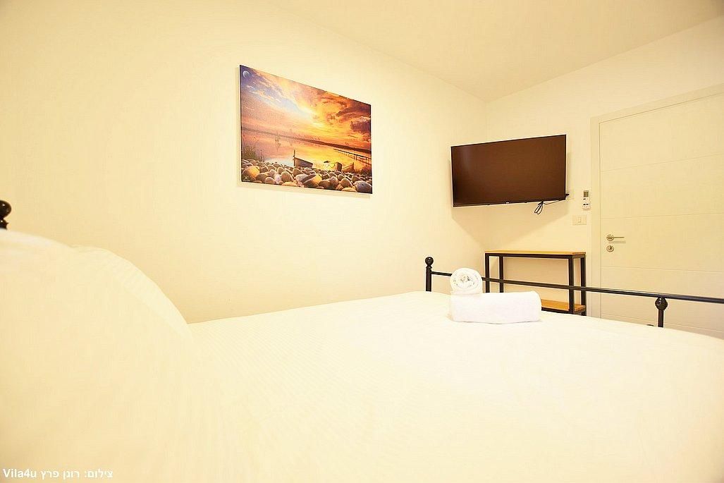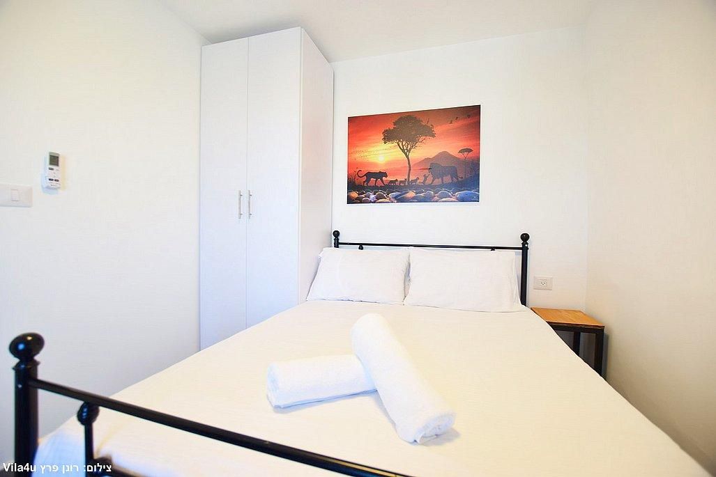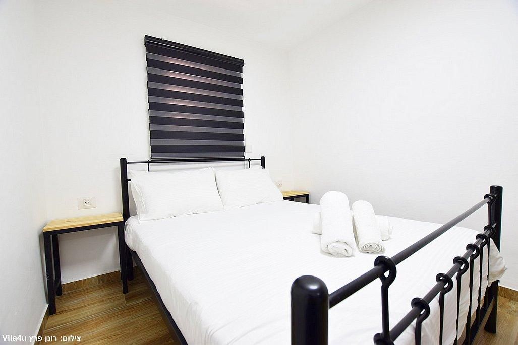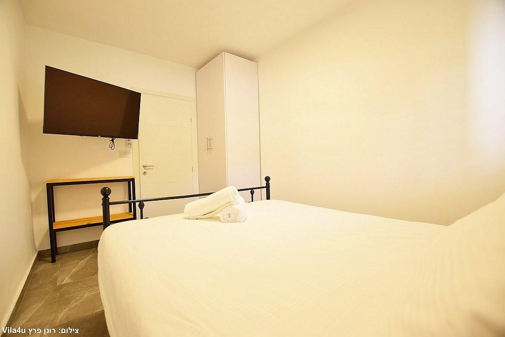 אבזור החדרים: מיטה זוגית, מזגן, טלוויזיה חכמה בגודל 43 אינץ', ארון אחסון.